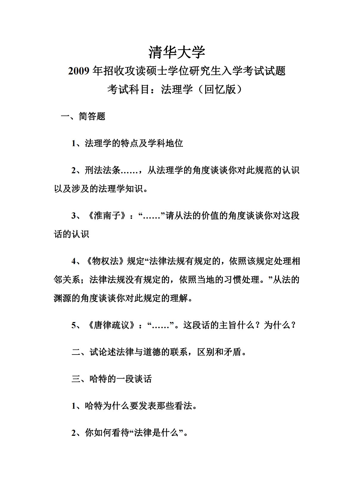 清华大学679法学综合卷(含法理学、宪法学)2009年真题回忆版