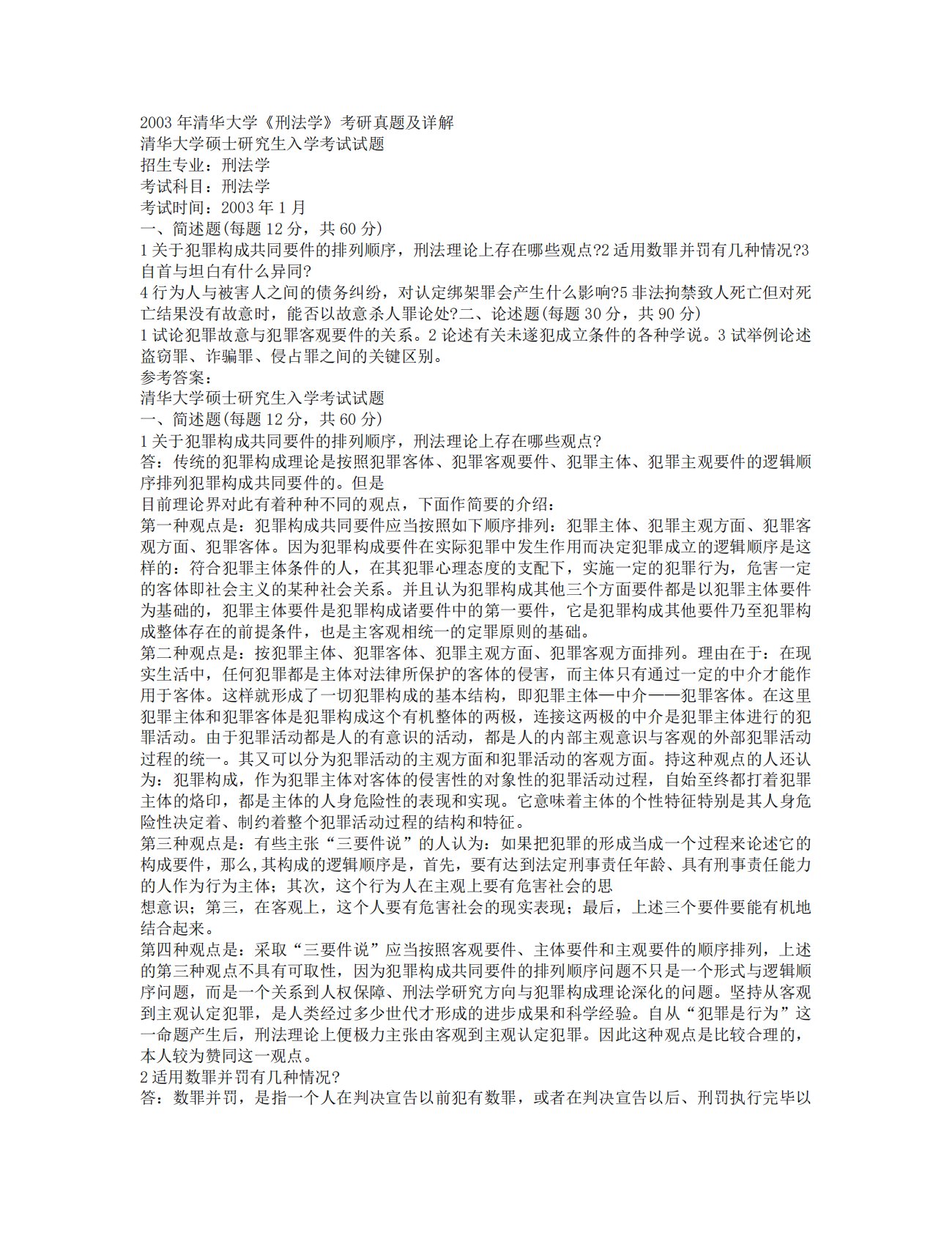 清华大学977专业综合卷二刑法学2003年真题及答案