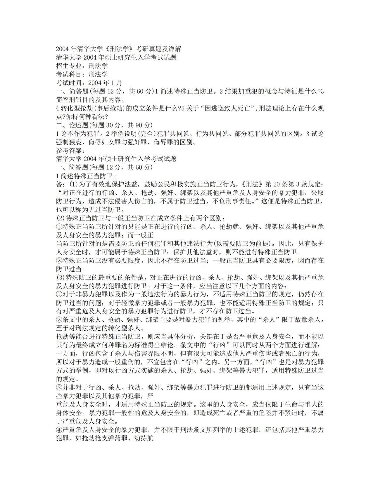 2004年清华大学《刑法学》考研真题及详解清华大学2004年硕士研究生入学考试试题招生专业:刑法学考试科目:刑法学考试时间:2004年1月一、简答题(每题12分,共60分)1简述特殊正当防卫。2结果加重犯的概念与特征是什么?3简答刑罚目的及其内容。4转化型抢劫(事后抢劫)的成立条件是什么?5关于“因逃逸致人死亡”,刑法理论上存在什么观点?你持何种看法?二、论述题(每题30分,共90分)1论不作为犯罪。2举例说明(完全)犯罪共同说、行为共同说、部分犯罪共同说的区别。3试论强制猥亵、侮辱妇女罪与强奸罪、侮辱罪的区别。参考答案:清华大学2004年硕士研究生入学考试试题一、简答题(每题12分,共60分...