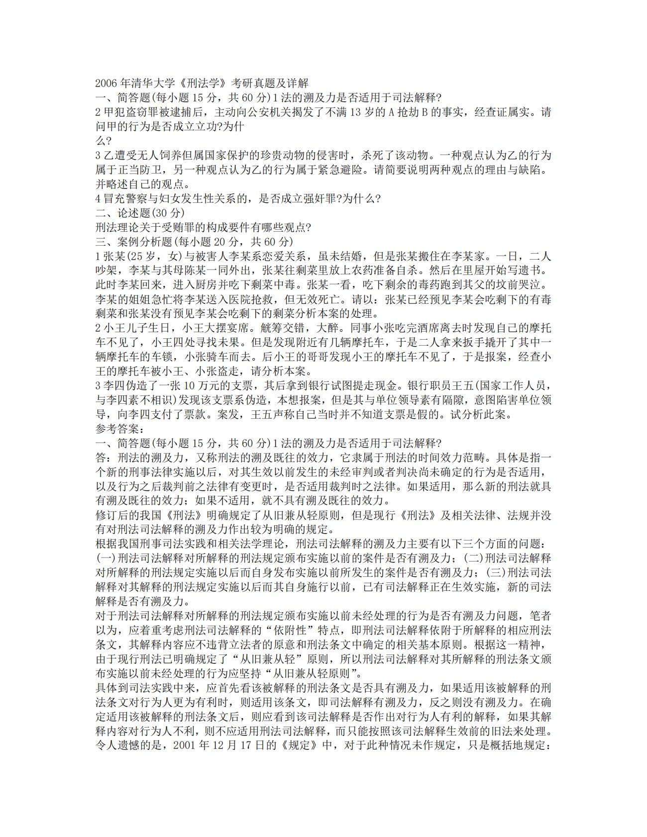 2006年清华大学《刑法学》考研真题及详解一、简答题(每小题15分,共60分)1法的溯及力是否适用于司法解释?2甲犯盗窃罪被逮捕后,主动向公安机关揭发了不满13岁的A抢劫B的事实,经查证属实。请问甲的行为是否成立立功?为什么?3乙遭受无人饲养但属国家保护的珍贵动物的侵害时,杀死了该动物。一种观点认为乙的行为属于正当防卫,另一种观点认为乙的行为属于紧急避险。请简要说明两种观点的理由与缺陷。并略述自己的观点。4冒充警察与妇女发生性关系的,是否成立强奸罪?为什么?二、论述题(30分)刑法理论关于受贿罪的构成要件有哪些观点?三、案例分析题(每小题20分,共60分)1张某(25岁,女)与被害人李某系恋爱...