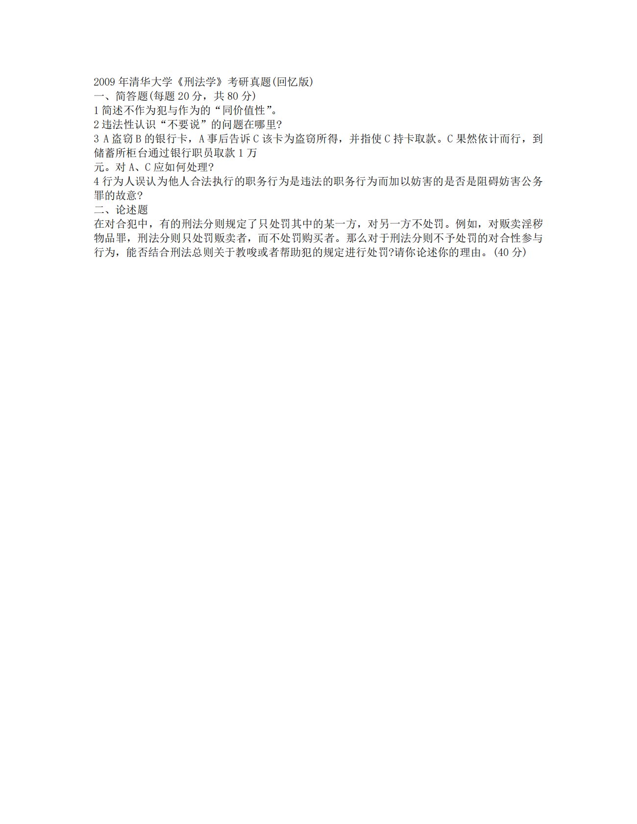 清华大学977专业综合卷二刑法学2009年真题(回忆版)