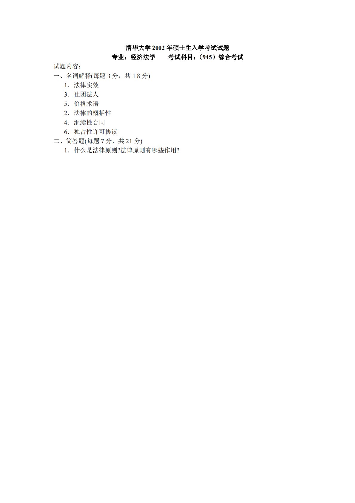 清华大学2002年硕士生入学考试试题专业:经济法学考试科目:(945)综合考试试题内容:一、名词解释(每题3分,共18分)1.法律实效3.社团法人5.价格术语2.法律的概括性4.继续性合同6.独占性许可协议二、简答题(每题7分,共21分)1.什么是法律原则?法律原则有哪些作用?清华大学2002年硕士生入学考试试题专业:经济法学考试科目:(945)综合考试试题内容:一、名词解释(每题3分,共18分)1.法律实效3.社团法人5.价格术语2.法律的概括性4.继续性合同6.独占性许可协议二、简答题(每题7分,共21分)1.什么是法律原则?法律原则有哪些作用?2.用益物权的特征。3.中外合作经营企业与中...