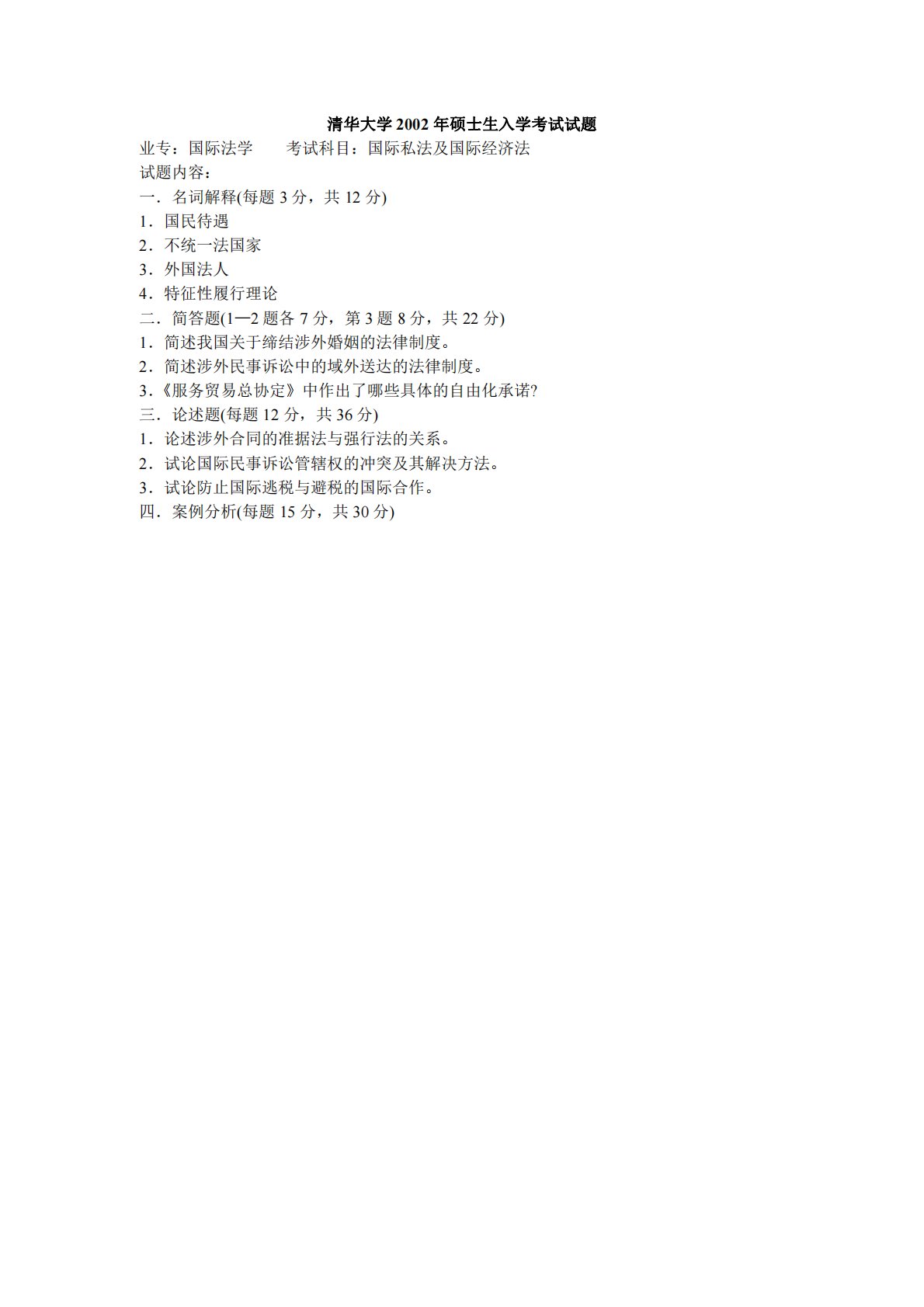 清华大学2002年硕士生入学考试试题业专:国际法学考试科目:国际私法及国际经济法试题内容:一.名词解释(每题3分,共12分)1.国民待遇2.不统一法国家3.外国法人4.特征性履行理论二.简答题(1—2题各7分,第3题8分,共22分)1.简述我国关于缔结涉外婚姻的法律制度。2.简述涉外民事诉讼中的域外送达的法律制度。3.《服务贸易总协定》中作出了哪些具体的自由化承诺?三.论述题(每题12分,共36分)1.论述涉外合同的准据法与强行法的关系。2.试论国际民事诉讼管辖权的冲突及其解决方法。3.试论防止国际逃税与避税的国际合作。四.案例分析(每题15分,共30分)清华大学2002年硕士生入学考试试题业...
