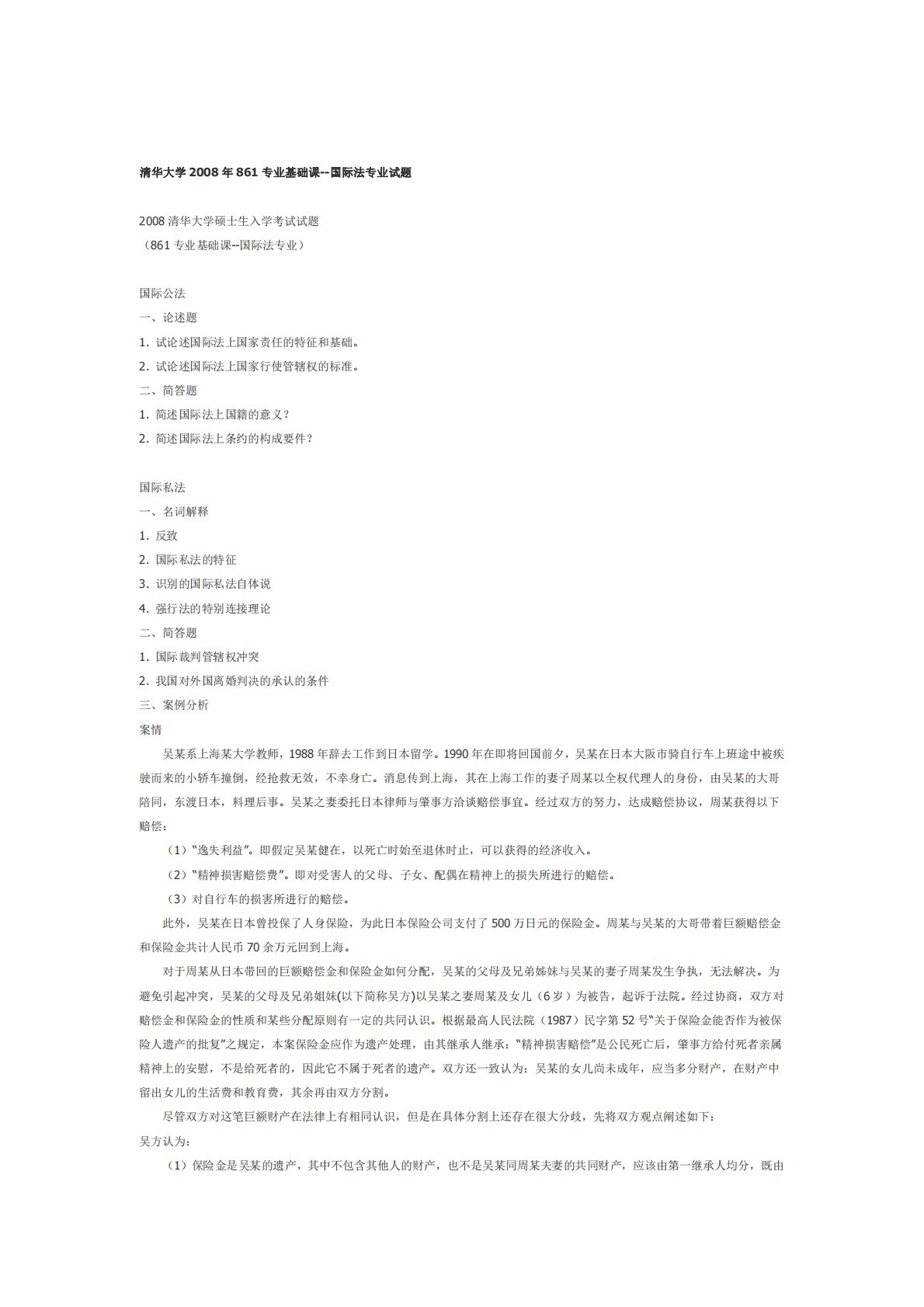 清华大学979专业综合卷四(含国际公法、国际私法)2008年真题