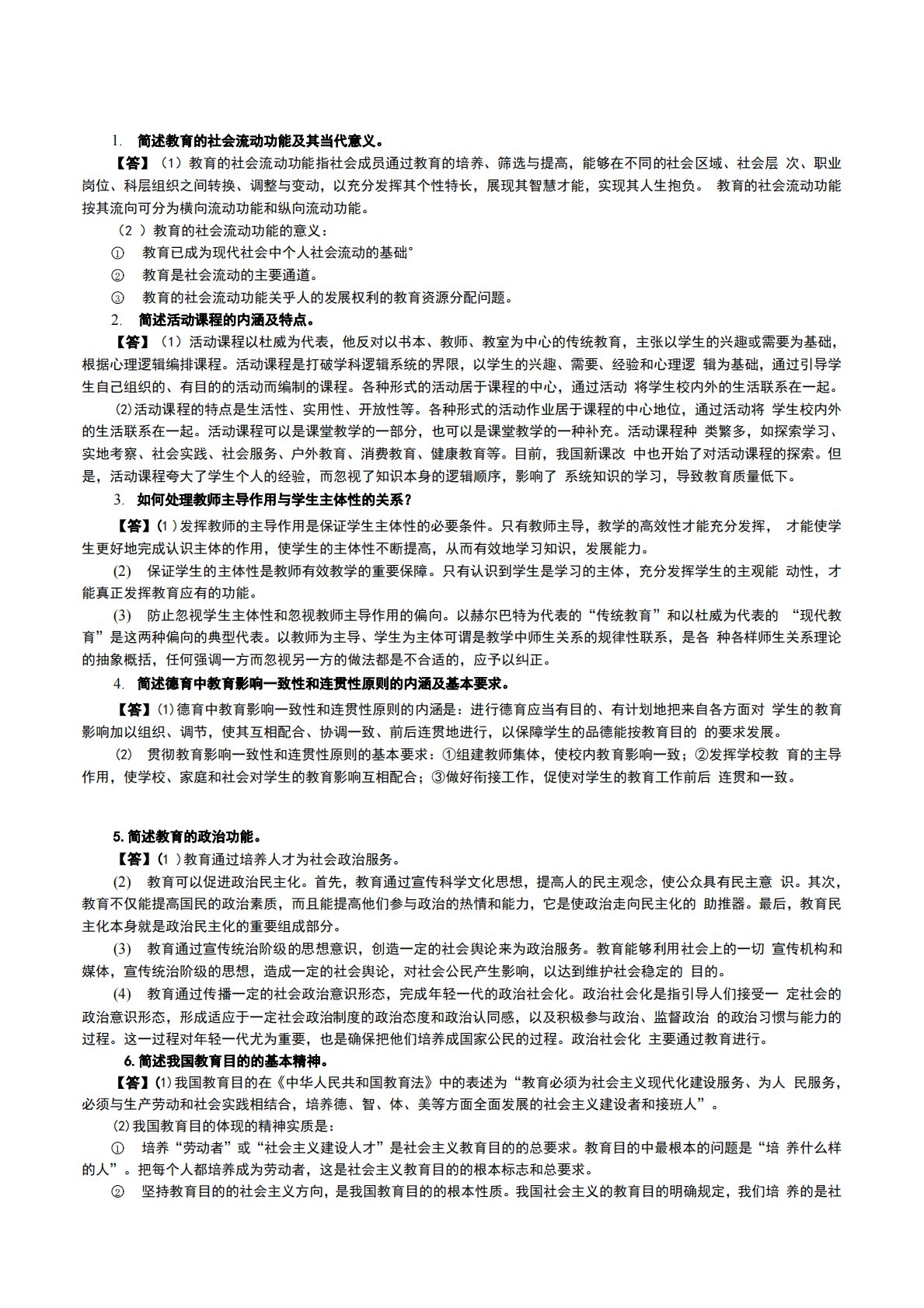 1.简述教育的社会流动功能及其当代意义。【答】(1)教育的社会流动功能指社会成员通过教育的培养、筛选与提高,能够在不同的社会区域、社会层次、职业岗位、科层组织之间转换、调整与变动,以充分发挥其个性特长,展现其智慧才能,实现其人生抱负。教育的社会流动功能按其流向可分为横向流动功能和纵向流动功能。(2)教育的社会流动功能的意义:1教育已成为现代社会中个人社会流动的基础°2教育是社会流动的主要通道。3教育的社会流动功能关乎人的发展权利的教育资源分配问题。2.简述活动课程的内涵及特点。【答】(1)活动课程以杜威为代表,他反对以书本、教师、教室为中心的传统教育,主张以学生的兴趣或需要为基础,根据心理逻辑...