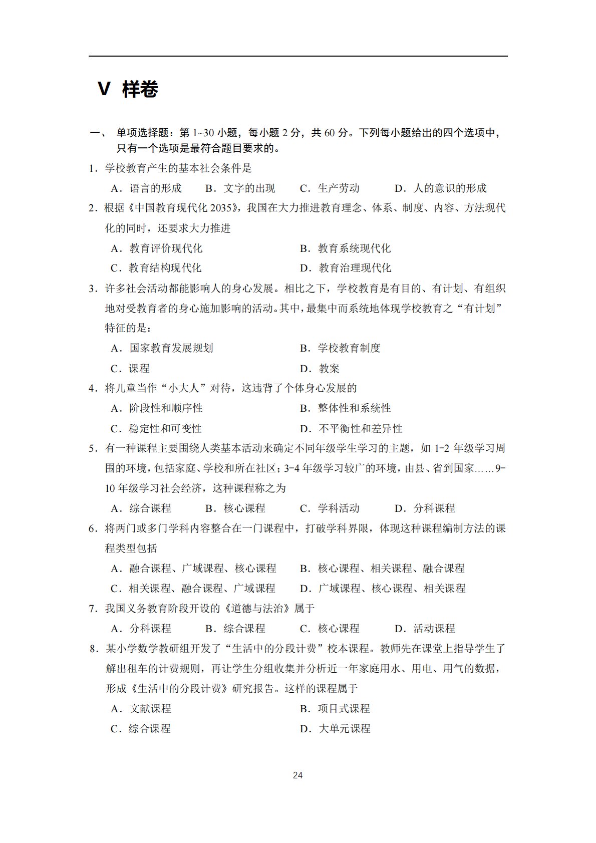 24Ⅴ样卷一、单项选择题:第1~30小题,每小题2分,共60分。下列每小题给出的四个选项中,只有一个选项是最符合题目要求的。1.学校教育产生的基本社会条件是A.语言的形成B.文字的出现C.生产劳动D.人的意识的形成2.根据《中国教育现代化2035》,我国在大力推进教育理念、体系、制度、内容、方法现代化的同时,还要求大力推进A.教育评价现代化B.教育系统现代化C.教育结构现代化D.教育治理现代化3.许多社会活动都能影响人的身心发展。相比之下,学校教育是有目的、有计划、有组织地对受教育者的身心施加影响的活动。其中,最集中而系统地体现学校教育之“有计划”特征的是:A.国家教育发展规划B.学校教育制度...
