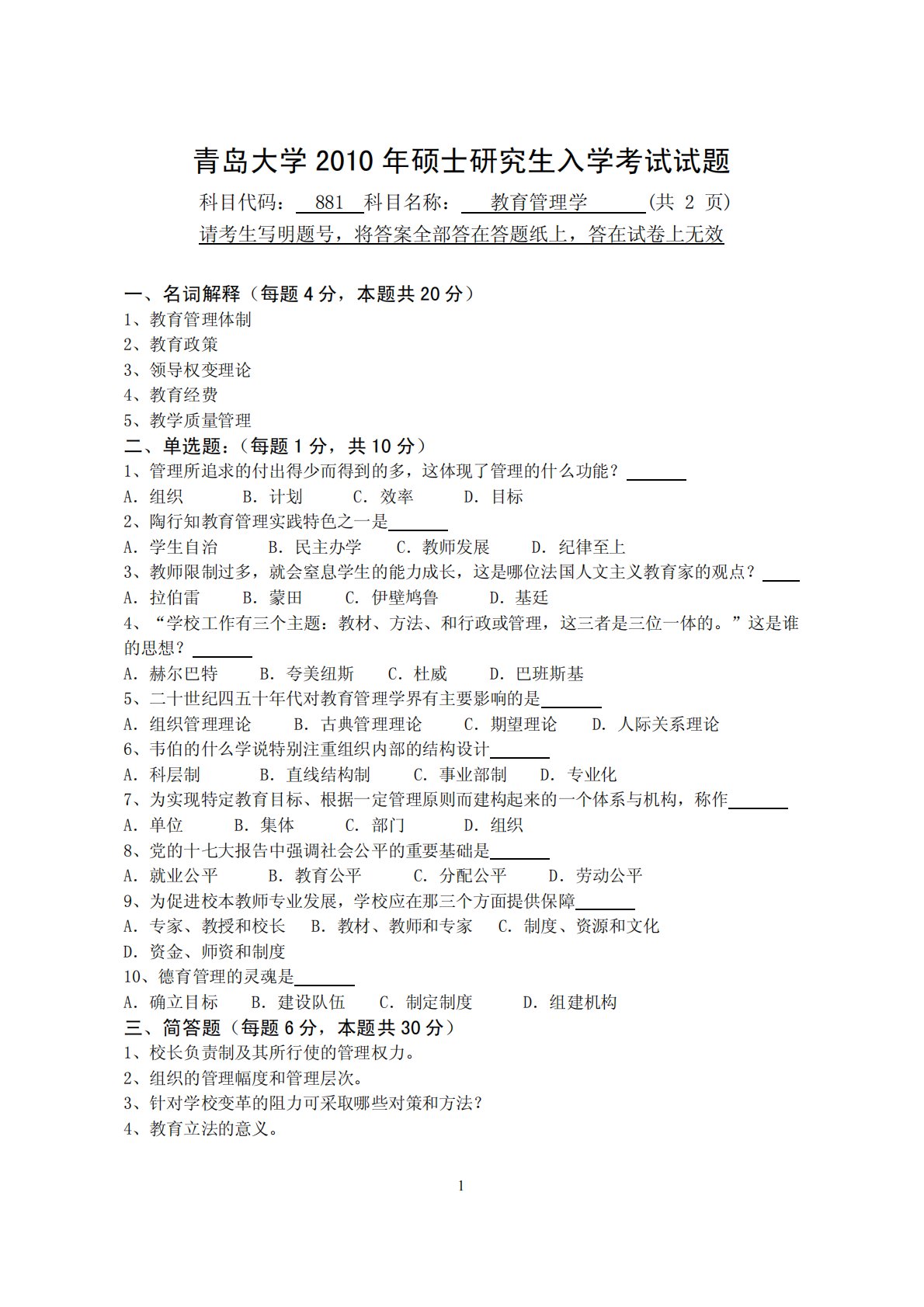 1青岛大学2010年硕士研究生入学考试试题科目代码:881科目名称:教育管理学(共2页)请考生写明题号,将答案全部答在答题纸上,答在试卷上无效一、名词解释(每题4分,本题共20分)1、教育管理体制2、教育政策3、领导权变理论4、教育经费5、教学质量管理二、单选题:(每题1分,共10分)1、管理所追求的付出得少而得到的多,这体现了管理的什么功能?A.组织B.计划C.效率D.目标2、陶行知教育管理实践特色之一是A.学生自治B.民主办学C.教师发展D.纪律至上3、教师限制过多,就会窒息学生的能力成长,这是哪位法国人文主义教育家的观点?A.拉伯雷B.蒙田C.伊壁鸠鲁D.基廷4、“学校工作有三个主题:教...