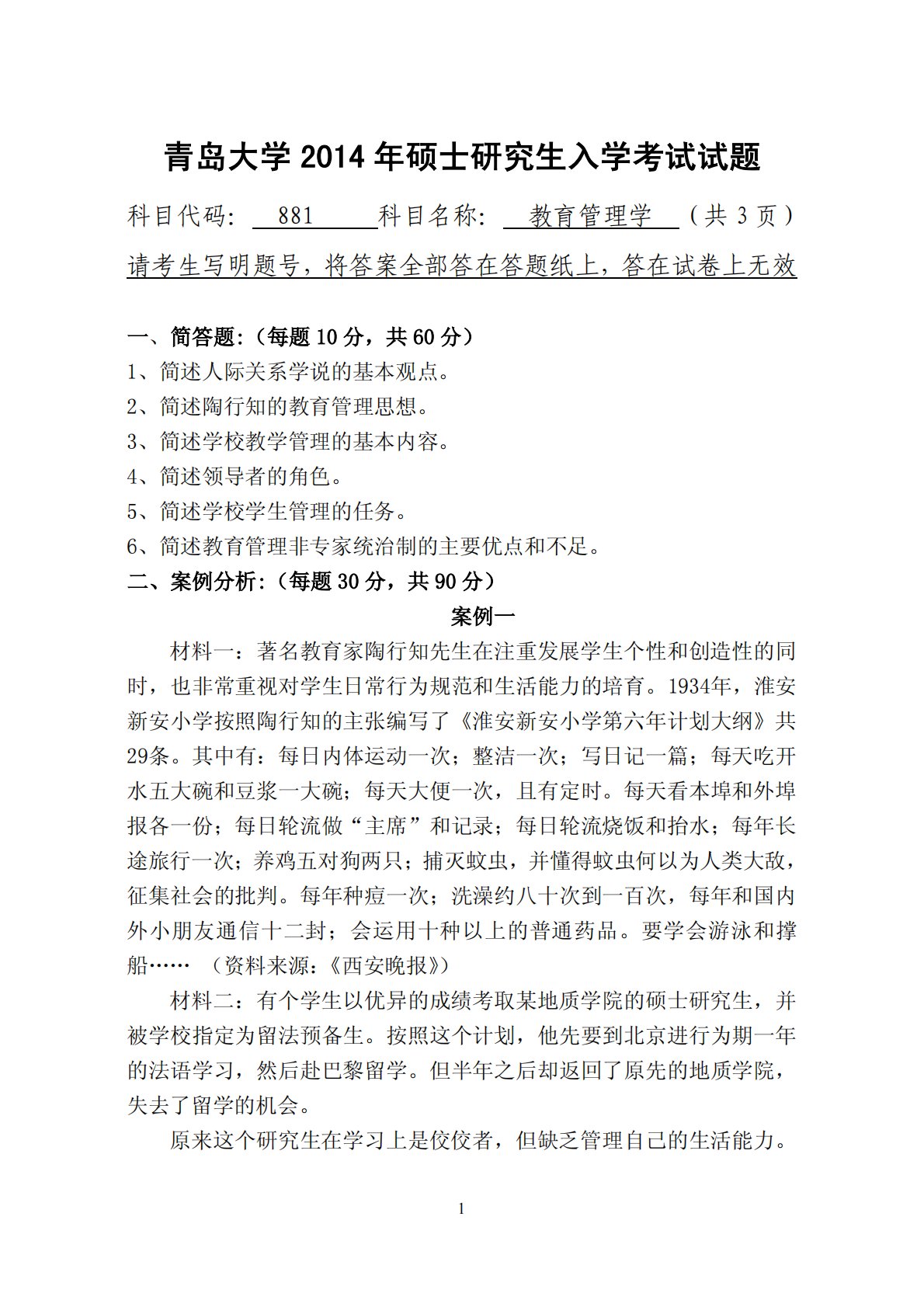 1青岛大学2014年硕士研究生入学考试试题科目代码:881科目名称:教育管理学(共3页)请考生写明题号,将答案全部答在答题纸上,答在试卷上无效一、简答题:(每题10分,共60分)1、简述人际关系学说的基本观点。2、简述陶行知的教育管理思想。3、简述学校教学管理的基本内容。4、简述领导者的角色。5、简述学校学生管理的任务。6、简述教育管理非专家统治制的主要优点和不足。二、案例分析:(每题30分,共90分)案例一材料一:著名教育家陶行知先生在注重发展学生个性和创造性的同时,也非常重视对学生日常行为规范和生活能力的培育。1934年,淮安新安小学按照陶行知的主张编写了《淮安新安小学第六年计划大纲》共2...