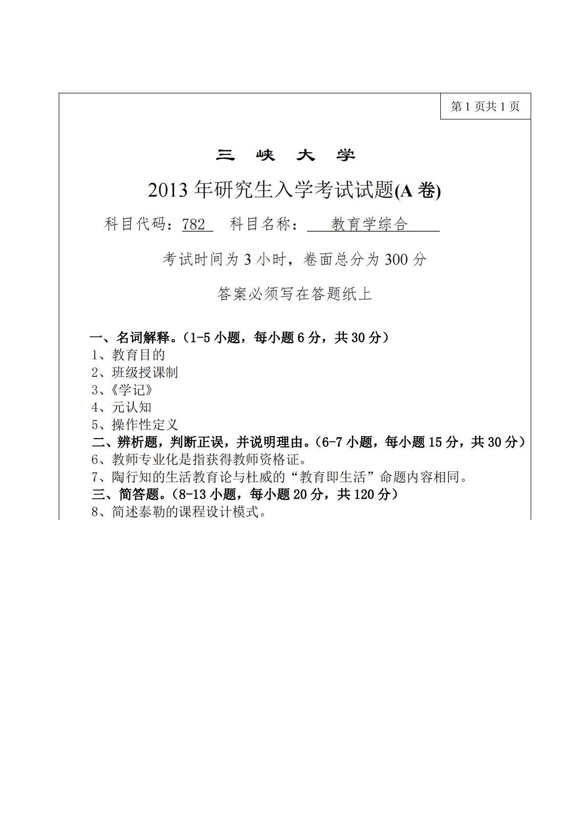 第1页共1页三峡大学2013年研究生入学考试试题(A卷)科目代码:782科目名称:教育学综合考试时间为3小时,卷面总分为300分答案必须写在答题纸上一、名词解释。(1-5小题,每小题6分,共30分)1、教育目的2、班级授课制3、《学记》4、元认知5、操作性定义二、辨析题,判断正误,并说明理由。(6-7小题,每小题15分,共30分)6、教师专业化是指获得教师资格证。7、陶行知的生活教育论与杜威的“教育即生活”命题内容相同。三、简答题。(8-13小题,每小题20分,共120分)8、简述泰勒的课程设计模式。第1页共1页三峡大学2013年研究生入学考试试题(A卷)科目代码:782科目名称:教育学综合考...
