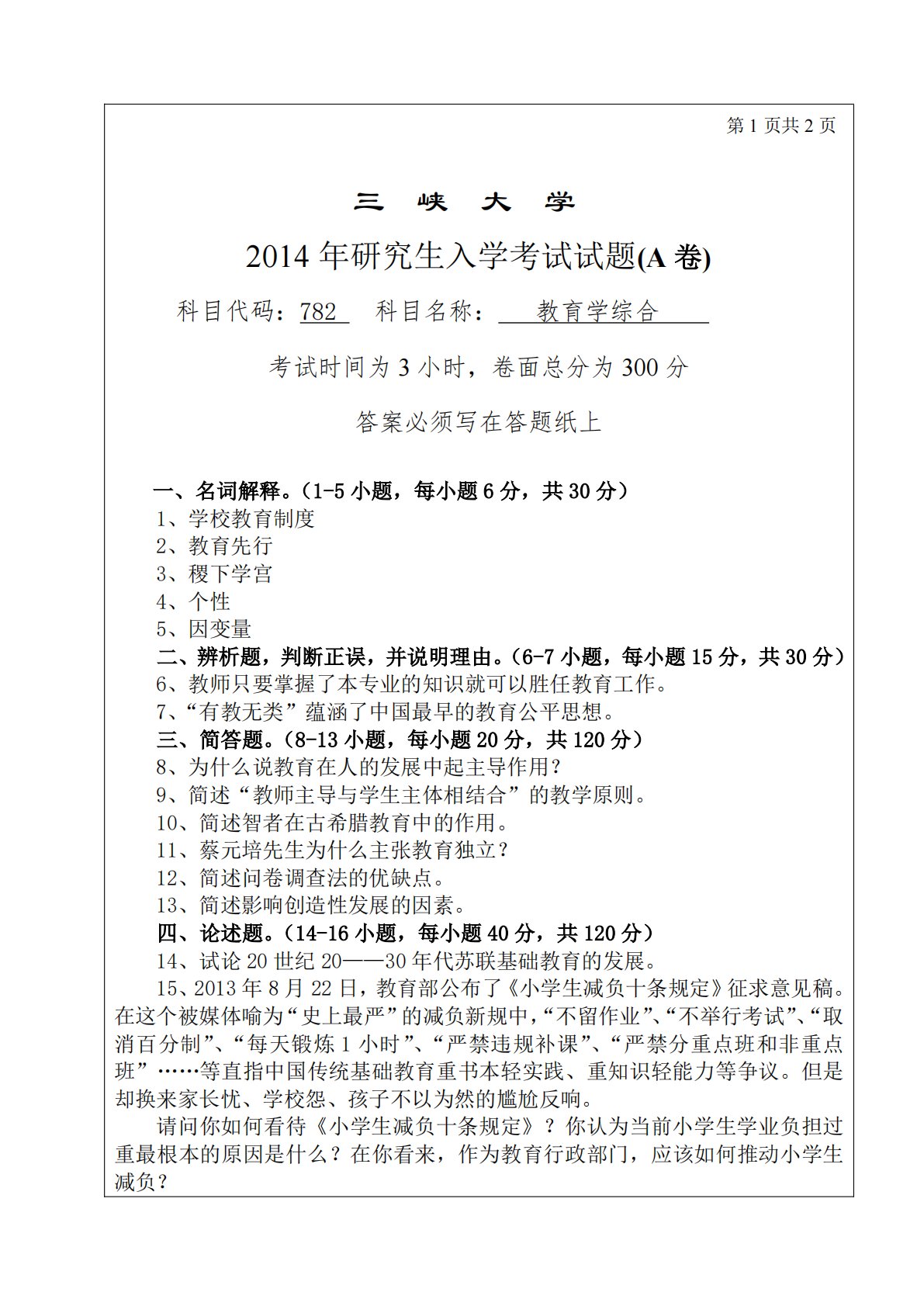 第1页共2页三峡大学2014年研究生入学考试试题(A卷)科目代码:782科目名称:教育学综合考试时间为3小时,卷面总分为300分答案必须写在答题纸上一、名词解释。(1-5小题,每小题6分,共30分)1、学校教育制度2、教育先行3、稷下学宫4、个性5、因变量二、辨析题,判断正误,并说明理由。(6-7小题,每小题15分,共30分)6、教师只要掌握了本专业的知识就可以胜任教育工作。7、“有教无类”蕴涵了中国最早的教育公平思想。三、简答题。(8-13小题,每小题20分,共120分)8、为什么说教育在人的发展中起主导作用?9、简述“教师主导与学生主体相结合”的教学原则。10、简述智者在古希腊教育中的作用...