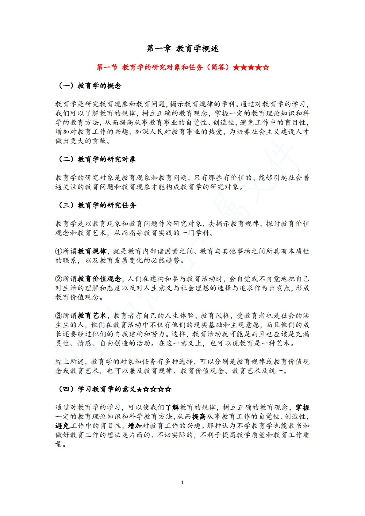 1第一章教育学概述第一节教育学的研究对象和任务(简答)★★★★☆(一)教育学的概念教育学是研究教育现象和教育问题,揭示教育规律的学科。通过对教育学的学习,我们可以了解教育的规律,树立正确的教育观念,掌握一定的教育理论知识和科学的教育方法,从而提高从事教育事业的自觉性、创造性,避免工作中的盲目性,增加对教育工作的兴趣,加深人民对教育事业的热爱,为培养社会主义建设人才做出更大的贡献。(二)教育学的研究对象教育学的研究对象是教育现象和教育问题,只有那些有价值的、能够引起社会普遍关注的教育问题和教育现象才能构成教育学的研究对象。(三)教育学的研究任务教育学是以教育现象和教育问题作为研究对象,去揭示教育...