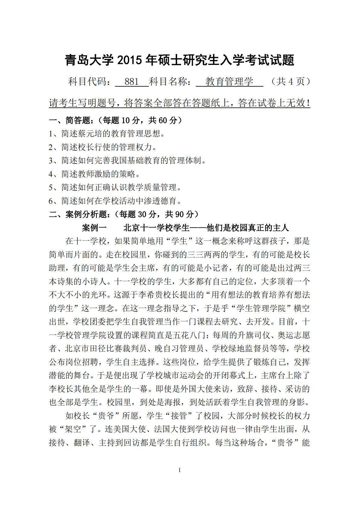 1青岛大学2015年硕士研究生入学考试试题科目代码:881科目名称:教育管理学(共4页)请考生写明题号,将答案全部答在答题纸上,答在试卷上无效!一、简答题:(每题10分,共60分)1、简述蔡元培的教育管理思想。2、简述校长行使的管理权力。3、简述如何完善我国基础教育的管理体制。4、简述教师激励的策略。5、简述如何正确认识教学质量管理。6、简述如何在学校活动中渗透德育。二、案例分析题:(每题30分,共90分)案例一北京十一学校学生——他们是校园真正的主人在十一学校,如果简单地用“学生”这一概念来称呼这群孩子,那是简单而片面的。走在校园里,你碰到的三三两两的学生,有的可能是校长助理,有的可能是学生...