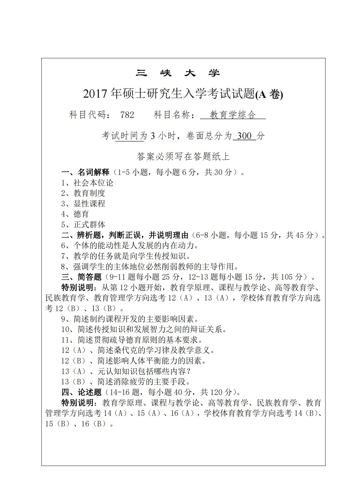 三峡大学2017年硕士研究生入学考试试题(A卷)科目代码:782科目名称:教育学综合考试时间为3小时,卷面总分为300分答案必须写在答题纸上一、名词解释(1-5小题,每小题6分,共30分)。1、社会本位论2、教育制度3、显性课程4、德育5、正式群体二、辨析题,判断正误,并说明理由(6-8小题,每小题15分,共45分)。6、个体的能动性是人发展的内在动力。7、教学的任务就是向学生传授知识。8、强调学生的主体地位必然削弱教师的主导作用。三、简答题(9-11题每小题25分,12-13题每小题15分,共105分)。特别说明:从第12小题开始,教育学原理、课程与教学论、高等教育学、民族教育学、教育管理学...