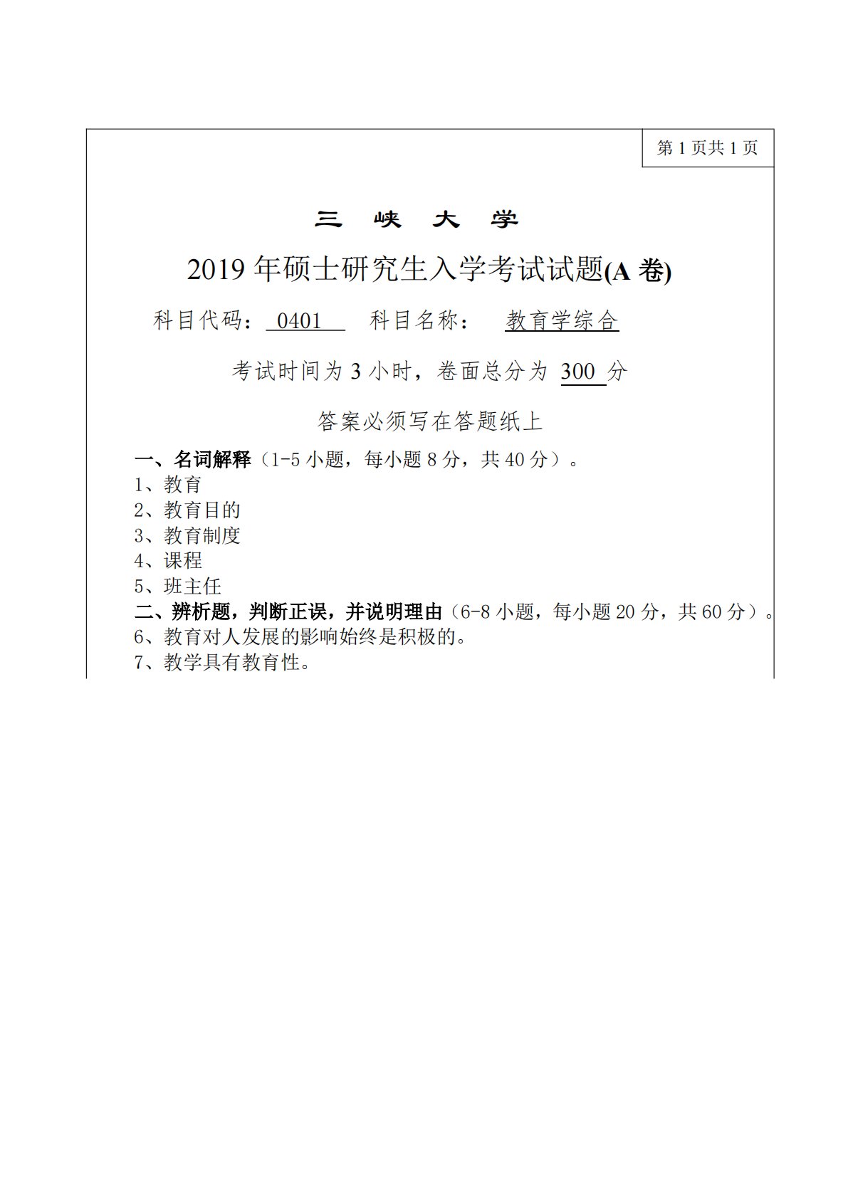 第1页共1页三峡大学2019年硕士研究生入学考试试题(A卷)科目代码:0401科目名称:教育学综合考试时间为3小时,卷面总分为300分答案必须写在答题纸上一、名词解释(1-5小题,每小题8分,共40分)。1、教育2、教育目的3、教育制度4、课程5、班主任二、辨析题,判断正误,并说明理由(6-8小题,每小题20分,共60分)。6、教育对人发展的影响始终是积极的。7、教学具有教育性。第1页共1页三峡大学2019年硕士研究生入学考试试题(A卷)科目代码:0401科目名称:教育学综合考试时间为3小时,卷面总分为300分答案必须写在答题纸上一、名词解释(1-5小题,每小题8分,共40分)。1、教育2、教...