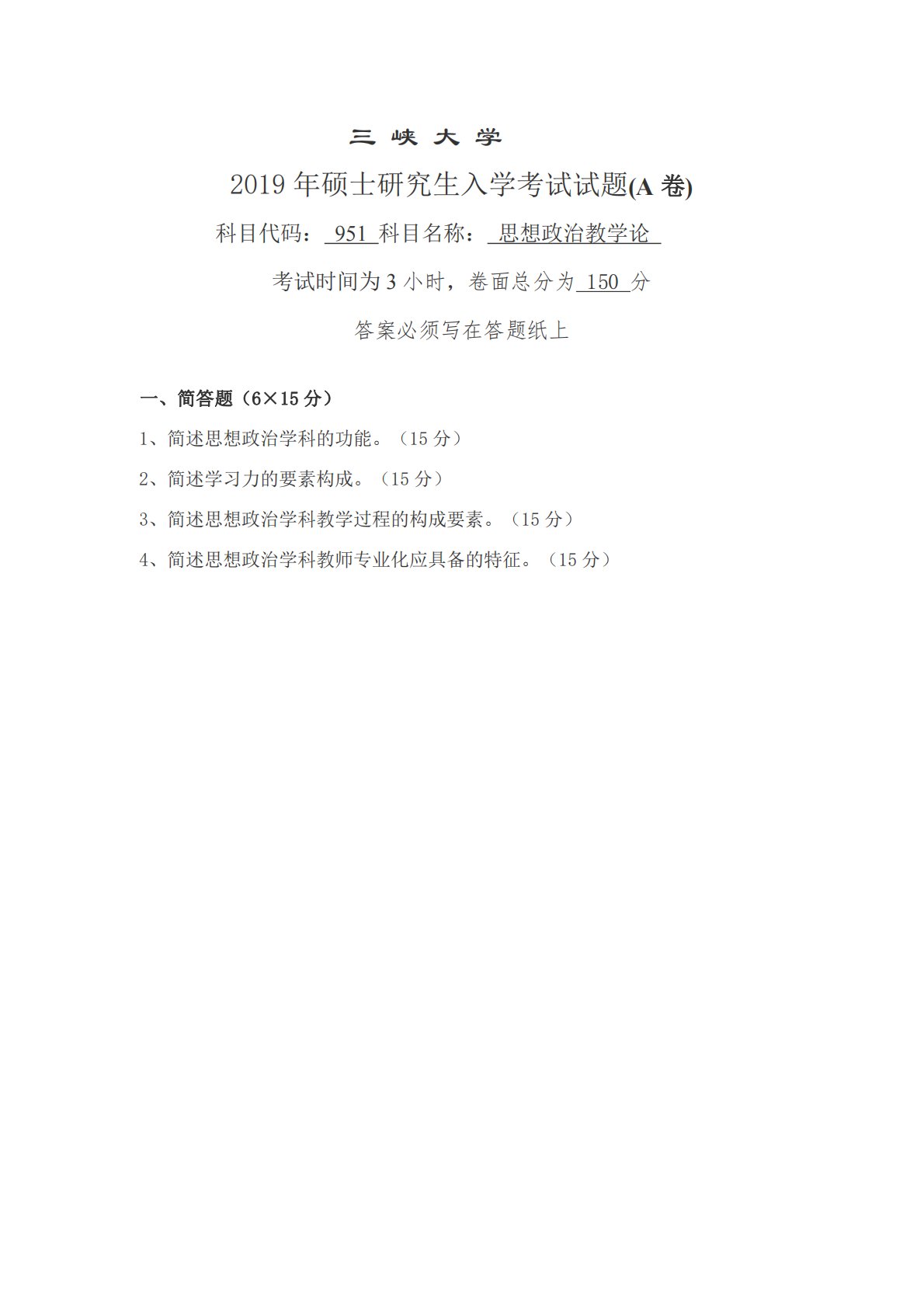 三峡大学2019年硕士研究生入学考试试题(A卷)科目代码:951科目名称:思想政治教学论考试时间为3小时,卷面总分为150分答案必须写在答题纸上一、简答题(6×15分)1、简述思想政治学科的功能。(15分)2、简述学习力的要素构成。(15分)3、简述思想政治学科教学过程的构成要素。(15分)4、简述思想政治学科教师专业化应具备的特征。(15分)三峡大学2019年硕士研究生入学考试试题(A卷)科目代码:951科目名称:思想政治教学论考试时间为3小时,卷面总分为150分答案必须写在答题纸上一、简答题(6×15分)1、简述思想政治学科的功能。(15分)2、简述学习力的要素构成。(15分)3、简述思想...