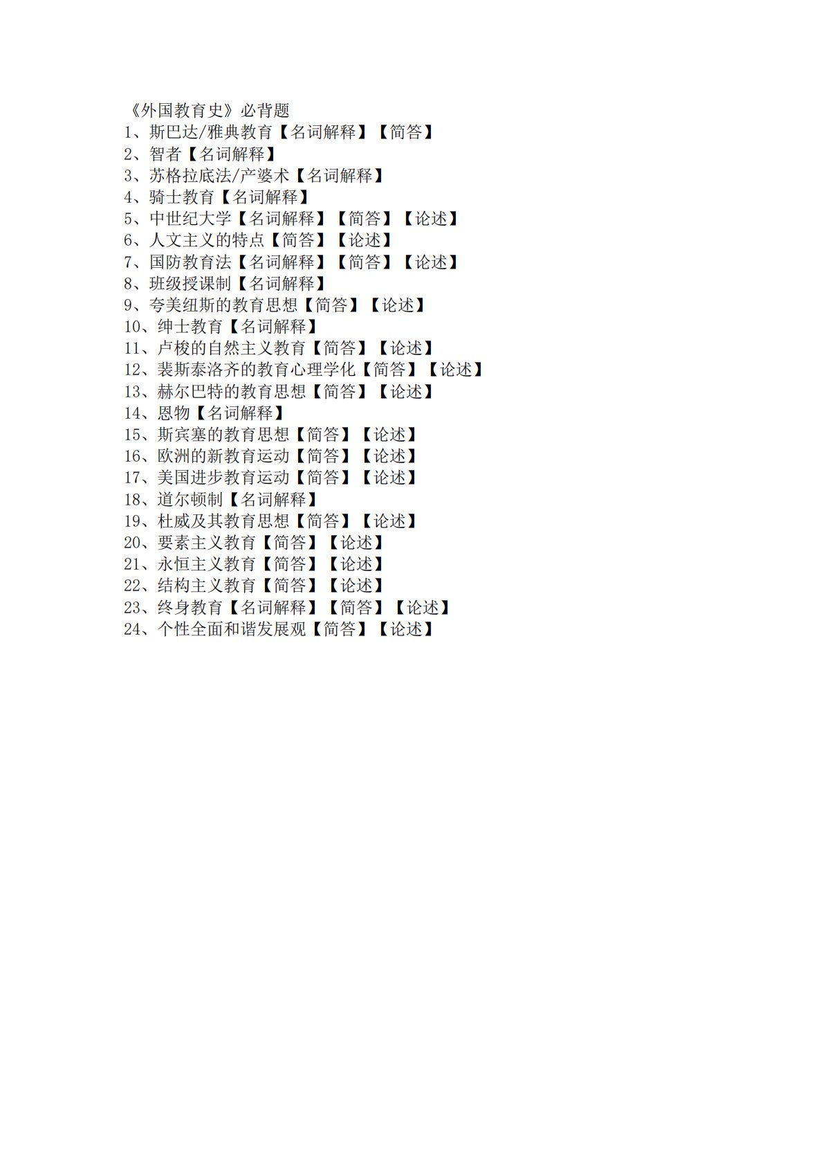 《外国教育史》必背题1、斯巴达/雅典教育【名词解释】【简答】2、智者【名词解释】3、苏格拉底法/产婆术【名词解释】4、骑士教育【名词解释】5、中世纪大学【名词解释】【简答】【论述】6、人文主义的特点【简答】【论述】7、国防教育法【名词解释】【简答】【论述】8、班级授课制【名词解释】9、夸美纽斯的教育思想【简答】【论述】10、绅士教育【名词解释】11、卢梭的自然主义教育【简答】【论述】12、裴斯泰洛齐的教育心理学化【简答】【论述】13、赫尔巴特的教育思想【简答】【论述】14、恩物【名词解释】15、斯宾塞的教育思想【简答】【论述】16、欧洲的新教育运动【简答】【论述】17、美国进步教育运动【简答】...