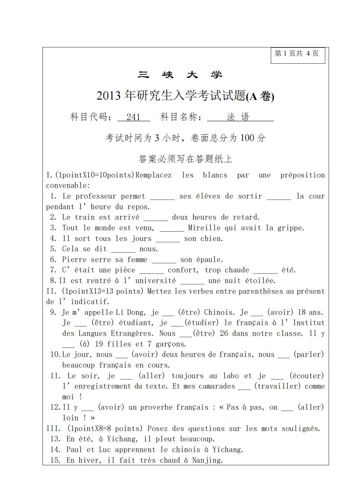 第1页共4页三峡大学2013年研究生入学考试试题(A卷)科目代码:241科目名称:法语考试时间为3小时,卷面总分为100分答案必须写在答题纸上lesblancsparuneprépositionI.(1pointX10=10points)Remplacezconvenable:1.Leprofesseurpermet______sesélèvesdesortir______lacourpendantl’heuredurepos.2.Letrainestarrivé______deuxheuresderetard.3.Toutlemondeestvenu,______Mireillequiava...