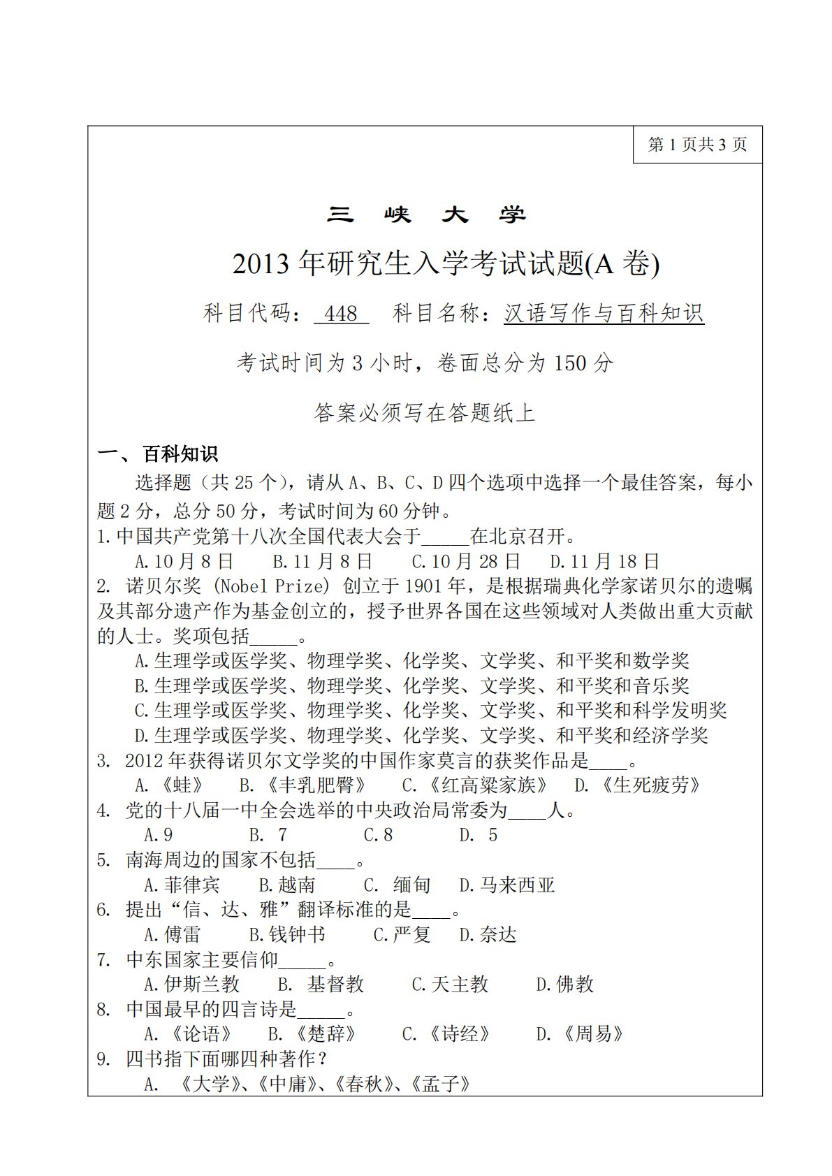 第1页共3页三峡大学2013年研究生入学考试试题(A卷)科目代码:448科目名称:汉语写作与百科知识考试时间为3小时,卷面总分为150分答案必须写在答题纸上一、百科知识选择题(共25个),请从A、B、C、D四个选项中选择一个最佳答案,每小题2分,总分50分,考试时间为60分钟。1.中国共产党第十八次全国代表大会于_____在北京召开。A.10月8日B.11月8日C.10月28日D.11月18日2.诺贝尔奖(NobelPrize)创立于1901年,是根据瑞典化学家诺贝尔的遗嘱及其部分遗产作为基金创立的,授予世界各国在这些领域对人类做出重大贡献的人士。奖项包括_____。A.生理学或医学奖、物理学...