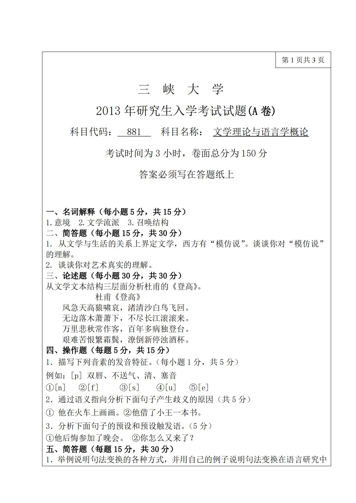 第1页共3页三峡大学2013年研究生入学考试试题(A卷)科目代码:881科目名称:文学理论与语言学概论考试时间为3小时,卷面总分为150分答案必须写在答题纸上一、名词解释(每小题5分,共15分)1.意境2.文学流派3.召唤结构二、简答题(每小题15分,共30分)1.从文学与生活的关系上界定文学,西方有“模仿说”。谈谈你对“模仿说”的理解。2.谈谈你对艺术真实的理解。三、论述题(每小题30分,共30分)从文学文本结构三层面分析杜甫的《登高》。杜甫《登高》风急天高猿啸哀,渚清沙白鸟飞回。无边落木萧萧下,不尽长江滚滚来。万里悲秋常作客,百年多病独登台。艰难苦恨繁霜鬓,潦倒新停浊酒杯。四、操作题(每题...