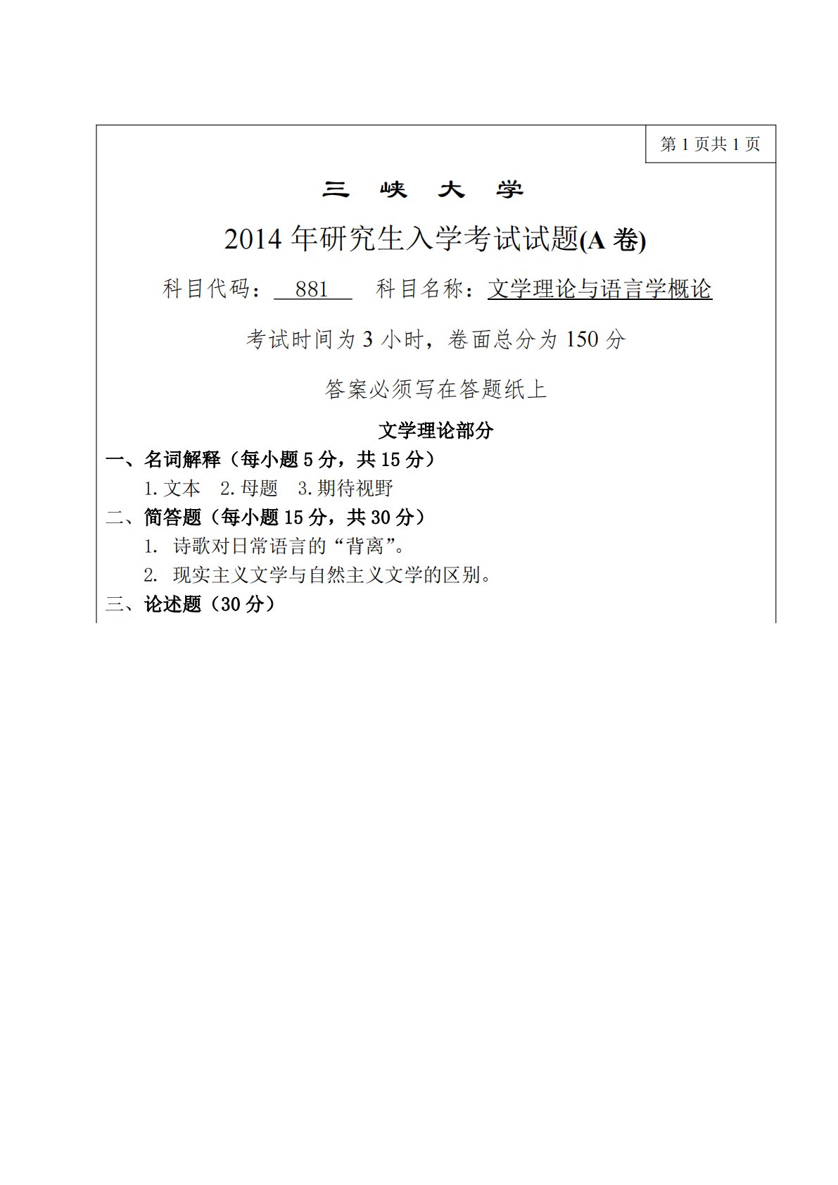 第1页共1页三峡大学2014年研究生入学考试试题(A卷)科目代码:881科目名称:文学理论与语言学概论考试时间为3小时,卷面总分为150分答案必须写在答题纸上文学理论部分一、名词解释(每小题5分,共15分)1.文本2.母题3.期待视野二、简答题(每小题15分,共30分)1.诗歌对日常语言的“背离”。2.现实主义文学与自然主义文学的区别。三、论述题(30分)第1页共1页三峡大学2014年研究生入学考试试题(A卷)科目代码:881科目名称:文学理论与语言学概论考试时间为3小时,卷面总分为150分答案必须写在答题纸上文学理论部分一、名词解释(每小题5分,共15分)1.文本2.母题3.期待视野二、简答...