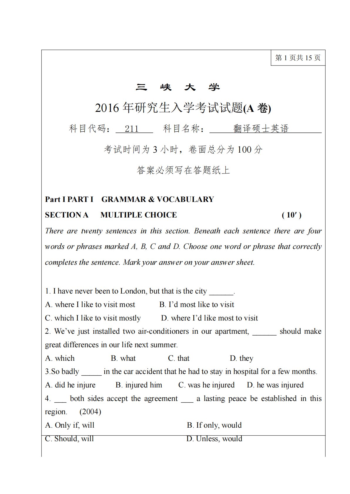 第1页共15页三峡大学2016年研究生入学考试试题(A卷)科目代码:211科目名称:翻译硕士英语考试时间为3小时,卷面总分为100分答案必须写在答题纸上PartIPARTIGRAMMAR&VOCABULARYSECTIONAMULTIPLECHOICE(10′)Therearetwentysentencesinthissection.BeneatheachsentencetherearefourwordsorphrasesmarkedA,B,CandD.Chooseonewordorphrasethatcorrectlycompletesthesentence.Markyouransweron...