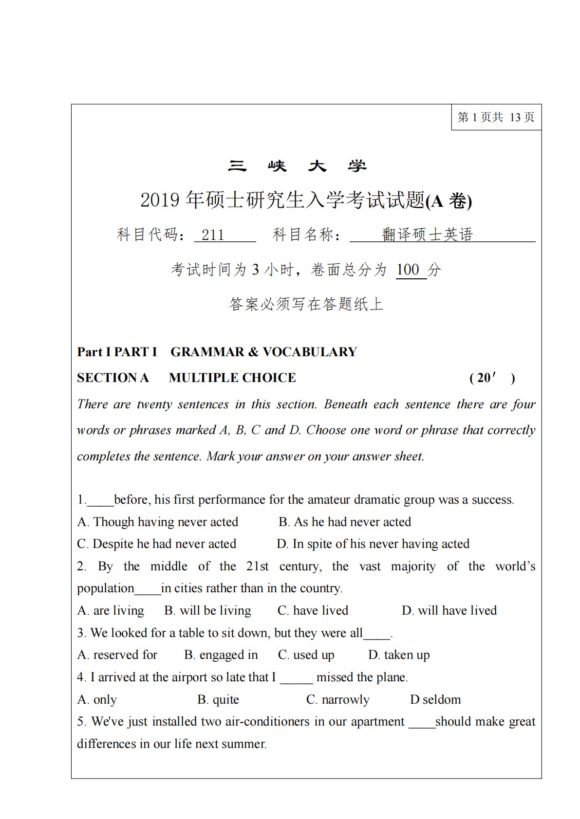 第1页共13页三峡大学2019年硕士研究生入学考试试题(A卷)科目代码:211科目名称:翻译硕士英语考试时间为3小时,卷面总分为100分答案必须写在答题纸上PartIPARTIGRAMMAR&VOCABULARYSECTIONAMULTIPLECHOICE(20′)Therearetwentysentencesinthissection.BeneatheachsentencetherearefourwordsorphrasesmarkedA,B,CandD.Chooseonewordorphrasethatcorrectlycompletesthesentence.Markyouranswer...