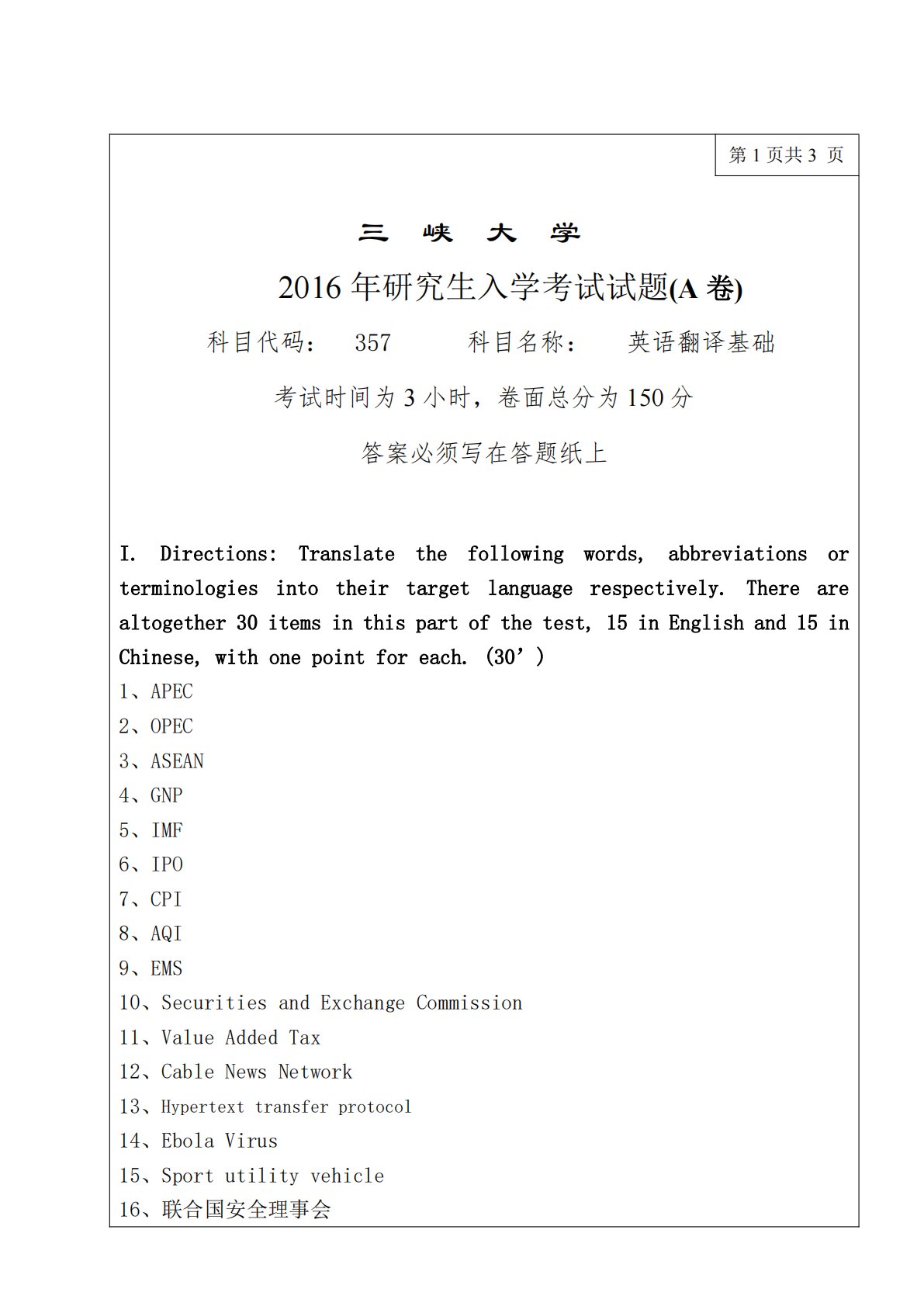 第1页共3页三峡大学2016年研究生入学考试试题(A卷)科目代码:357科目名称:英语翻译基础考试时间为3小时,卷面总分为150分答案必须写在答题纸上I.Directions:Translatethefollowingwords,abbreviationsorterminologiesintotheirtargetlanguagerespectively.Therearealtogether30itemsinthispartofthetest,15inEnglishand15inChinese,withonepointforeach.(30’)1、APEC2、OPEC3、ASEAN4、GNP5...