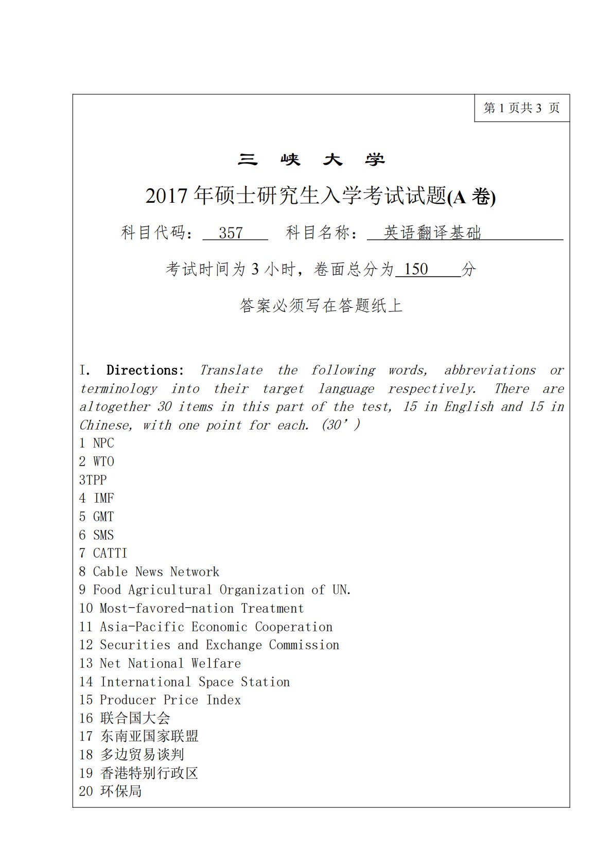 第1页共3页三峡大学2017年硕士研究生入学考试试题(A卷)科目代码:357科目名称:英语翻译基础考试时间为3小时,卷面总分为150分答案必须写在答题纸上I.Directions:Translatethefollowingwords,abbreviationsorterminologyintotheirtargetlanguagerespectively.Therearealtogether30itemsinthispartofthetest,15inEnglishand15inChinese,withonepointforeach.(30’)1NPC2WTO3TPP4IMF5GMT6SMS7...