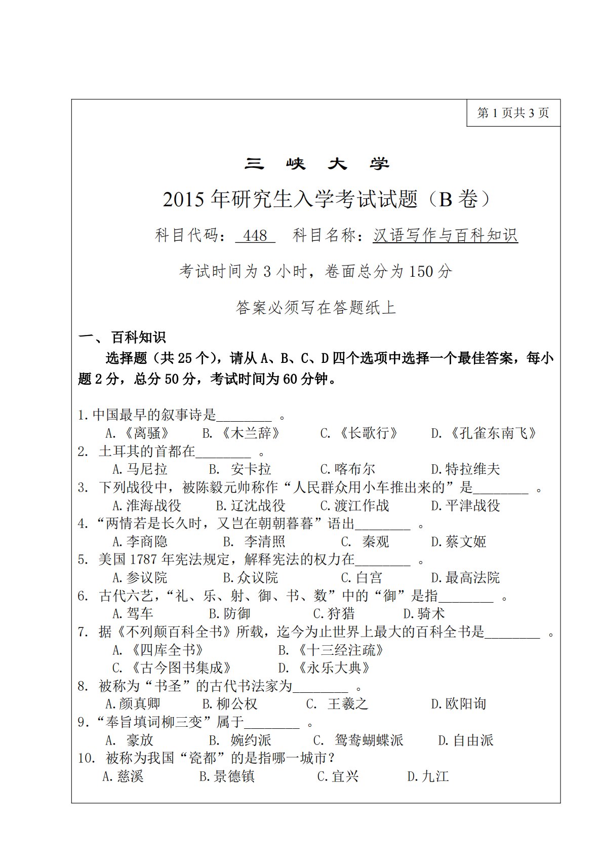 第1页共3页三峡大学2015年研究生入学考试试题(B卷)科目代码:448科目名称:汉语写作与百科知识考试时间为3小时,卷面总分为150分答案必须写在答题纸上一、百科知识选择题(共25个),请从A、B、C、D四个选项中选择一个最佳答案,每小题2分,总分50分,考试时间为60分钟。1.中国最早的叙事诗是________。A.《离骚》B.《木兰辞》C.《长歌行》D.《孔雀东南飞》2.土耳其的首都在________。A.马尼拉B.安卡拉C.喀布尔D.特拉维夫3.下列战役中,被陈毅元帅称作“人民群众用小车推出来的”是________。A.淮海战役B.辽沈战役C.渡江作战D.平津战役4.“两情若是长久时,...