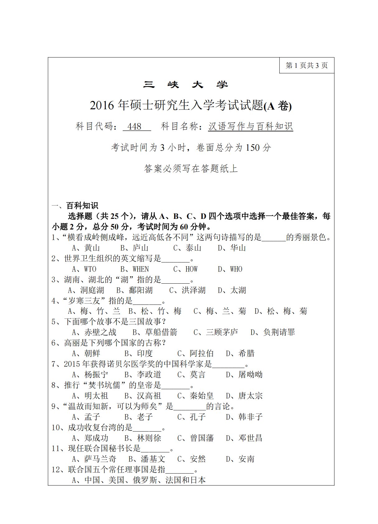 第1页共3页三峡大学2016年硕士研究生入学考试试题(A卷)科目代码:448科目名称:汉语写作与百科知识考试时间为3小时,卷面总分为150分答案必须写在答题纸上一、百科知识选择题(共25个),请从A、B、C、D四个选项中选择一个最佳答案,每小题2分,总分50分,考试时间为60分钟。1、“横看成岭侧成峰,远近高低各不同”这两句诗描写的是______的秀丽景色。A、黄山B、庐山C、泰山D、华山2、世界卫生组织的英文缩写是_______。A、WTOB、WHENC、HOWD、WHO3、湖南、湖北的“湖”指的是_______。A、洞庭湖B、鄱阳湖C、洪泽湖D、太湖4、“岁寒三友”指的是_______。A...