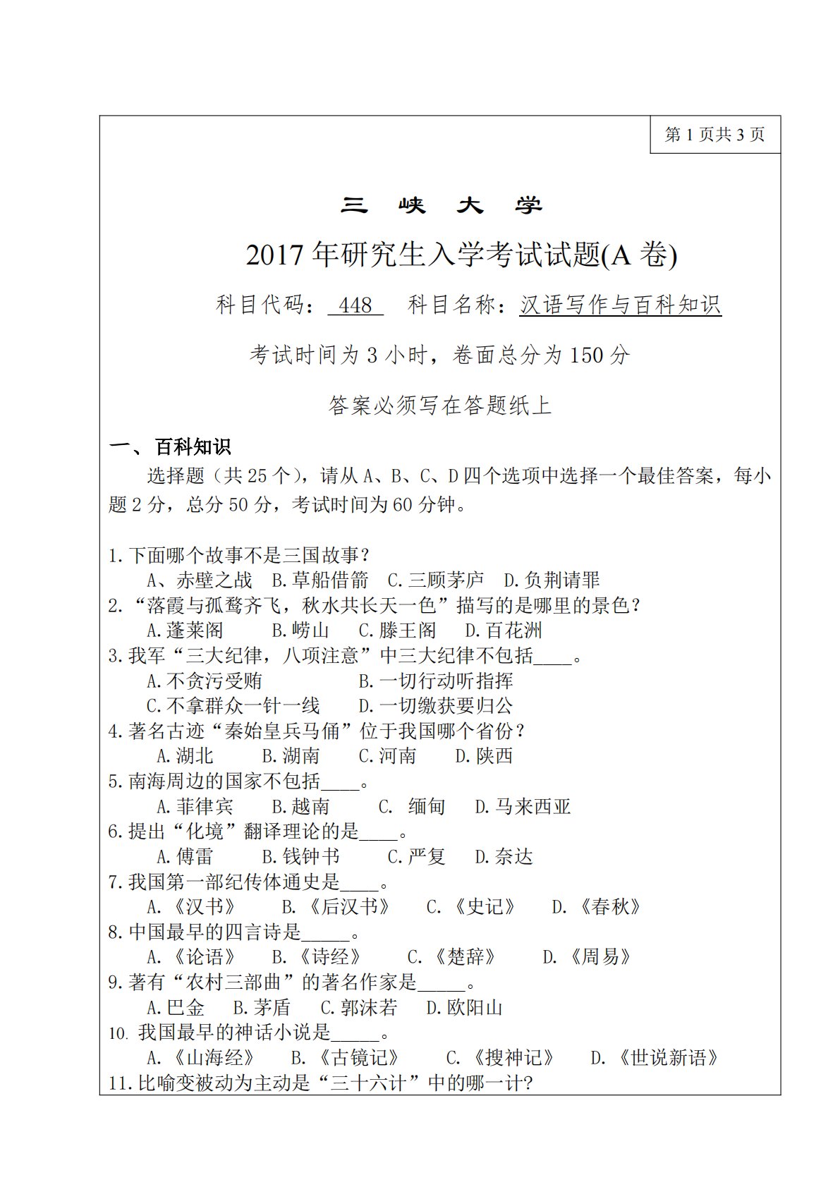 第1页共3页三峡大学2017年研究生入学考试试题(A卷)科目代码:448科目名称:汉语写作与百科知识考试时间为3小时,卷面总分为150分答案必须写在答题纸上一、百科知识选择题(共25个),请从A、B、C、D四个选项中选择一个最佳答案,每小题2分,总分50分,考试时间为60分钟。1.下面哪个故事不是三国故事?A、赤壁之战B.草船借箭C.三顾茅庐D.负荆请罪2.“落霞与孤鹜齐飞,秋水共长天一色”描写的是哪里的景色?A.蓬莱阁B.崂山C.滕王阁D.百花洲3.我军“三大纪律,八项注意”中三大纪律不包括____。A.不贪污受贿C.不拿群众一针一线B.一切行动听指挥D.一切缴获要归公4.著名古迹“秦始皇兵...