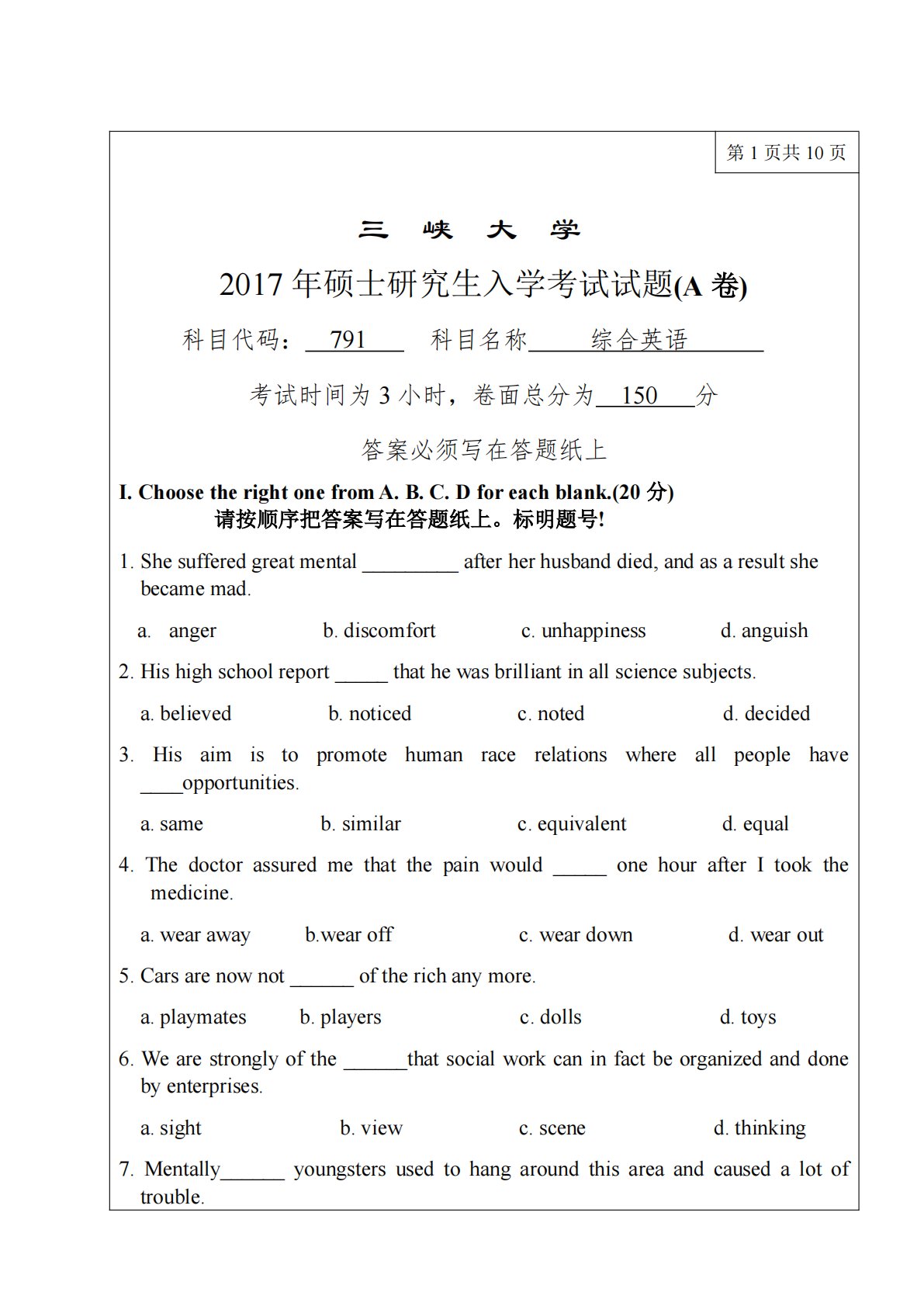 第1页共10页三峡大学2017年硕士研究生入学考试试题(A卷)科目代码:791科目名称综合英语考试时间为3小时,卷面总分为150分答案必须写在答题纸上Ⅰ.ChoosetherightonefromA.B.C.Dforeachblank.(20分)请按顺序把答案写在答题纸上。标明题号!1.Shesufferedgreatmental_________afterherhusbanddied,andasaresultshebecamemad.a.angerb.discomfortc.unhappinessd.anguish2.Hishighschoolreport_____thathewasbril...