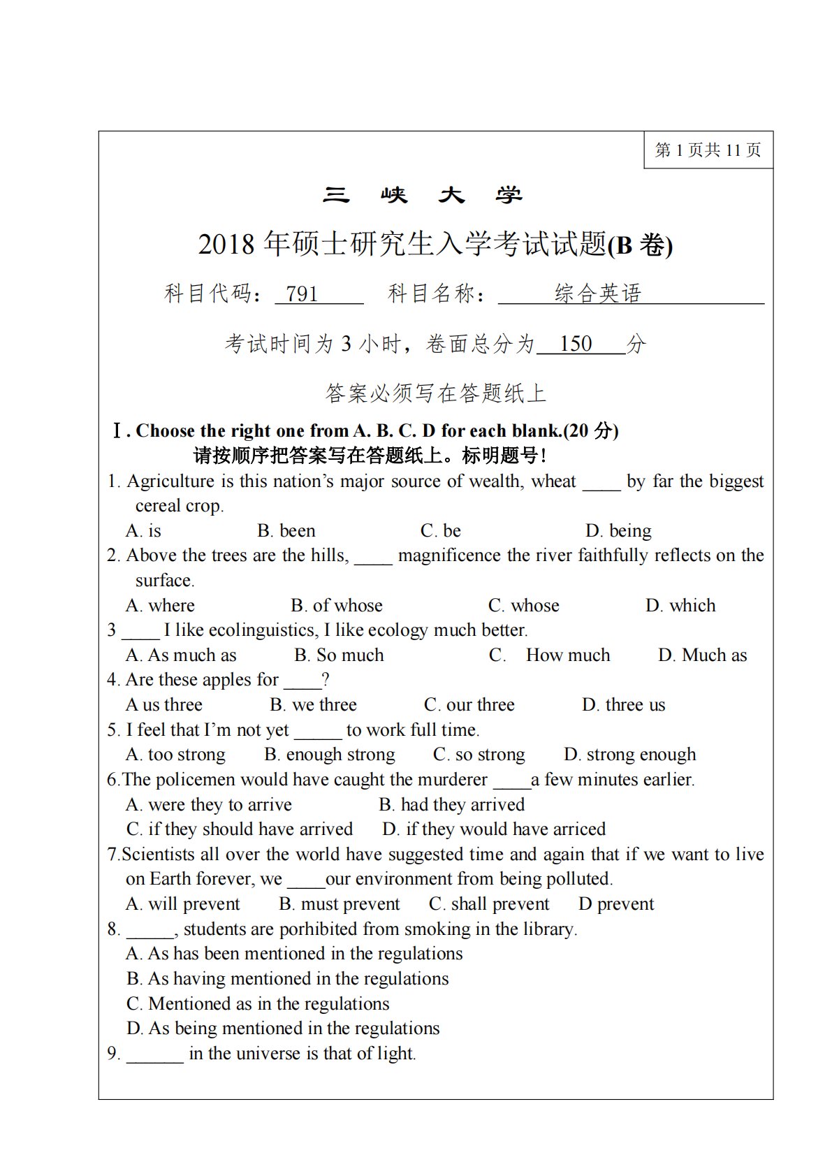 第1页共11页三峡大学2018年硕士研究生入学考试试题(B卷)科目代码:791科目名称:综合英语考试时间为3小时,卷面总分为150分答案必须写在答题纸上Ⅰ.ChoosetherightonefromA.B.C.Dforeachblank.(20分)请按顺序把答案写在答题纸上。标明题号!1.Agricultureisthisnation’smajorsourceofwealth,wheat____byfarthebiggestcerealcrop.A.isB.beenC.beD.being2.Abovethetreesarethehills,____magnificencetheriverfai...