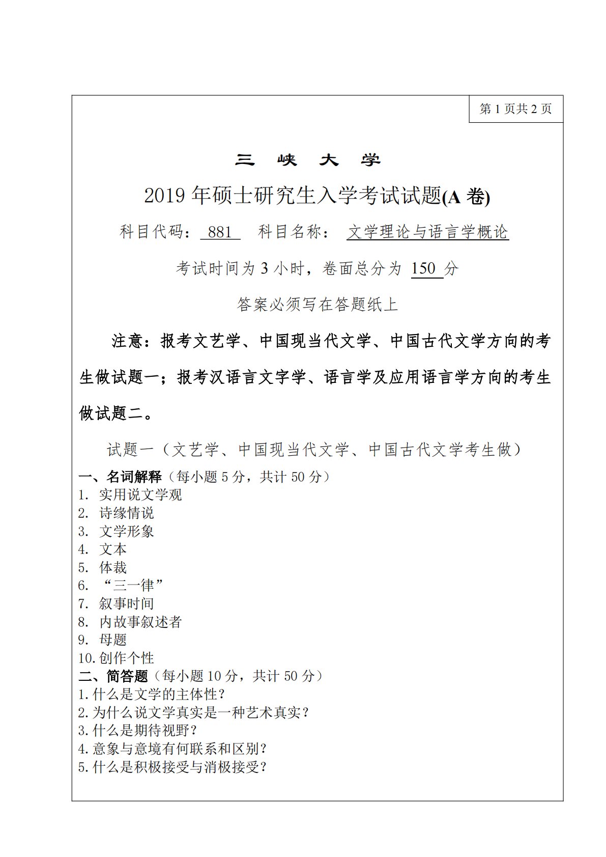第1页共2页三峡大学2019年硕士研究生入学考试试题(A卷)科目代码:881科目名称:文学理论与语言学概论考试时间为3小时,卷面总分为150分答案必须写在答题纸上注意:报考文艺学、中国现当代文学、中国古代文学方向的考生做试题一;报考汉语言文字学、语言学及应用语言学方向的考生做试题二。试题一(文艺学、中国现当代文学、中国古代文学考生做)一、名词解释(每小题5分,共计50分)1.实用说文学观2.诗缘情说3.文学形象4.文本5.体裁6.“三一律”7.叙事时间8.内故事叙述者9.母题10.创作个性二、简答题(每小题10分,共计50分)1.什么是文学的主体性?2.为什么说文学真实是一种艺术真实?3.什么...