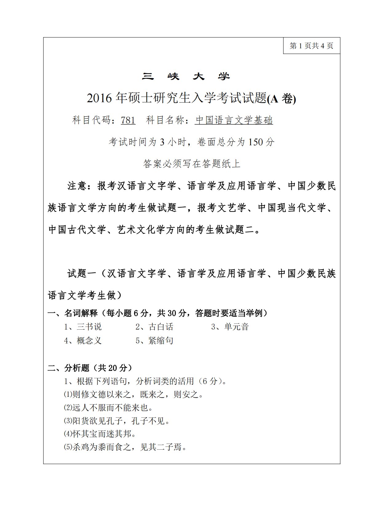 第1页共4页三峡大学2016年硕士研究生入学考试试题(A卷)科目代码:781科目名称:中国语言文学基础考试时间为3小时,卷面总分为150分答案必须写在答题纸上注意:报考汉语言文字学、语言学及应用语言学、中国少数民族语言文学方向的考生做试题一,报考文艺学、中国现当代文学、中国古代文学、艺术文化学方向的考生做试题二。试题一(汉语言文字学、语言学及应用语言学、中国少数民族语言文学考生做)一、名词解释(每小题6分,共30分,答题时要适当举例)1、三书说2、古白话3、单元音4、概念义5、紧缩句二、分析题(共20分)1、根据下列语句,分析词类的活用(6分)。⑴则修文德以来之,既来之,则安之。⑵远人不服而不...
