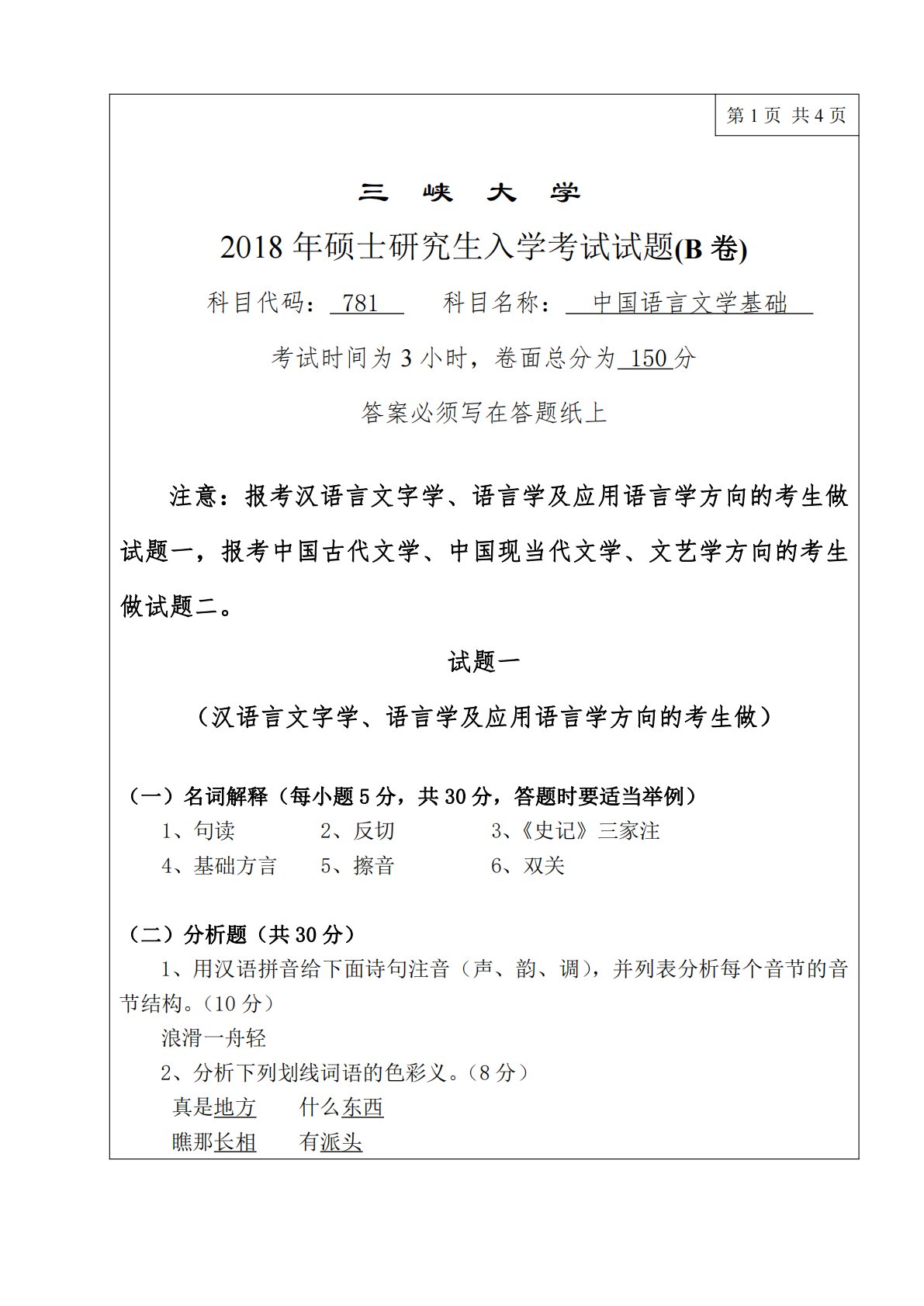 第1页共4页三峡大学2018年硕士研究生入学考试试题(B卷)科目代码:781科目名称:中国语言文学基础考试时间为3小时,卷面总分为150分答案必须写在答题纸上注意:报考汉语言文字学、语言学及应用语言学方向的考生做试题一,报考中国古代文学、中国现当代文学、文艺学方向的考生做试题二。试题一(汉语言文字学、语言学及应用语言学方向的考生做)(一)名词解释(每小题5分,共30分,答题时要适当举例)1、句读2、反切3、《史记》三家注4、基础方言5、擦音6、双关(二)分析题(共30分)1、用汉语拼音给下面诗句注音(声、韵、调),并列表分析每个音节的音节结构。(10分)浪滑一舟轻2、分析下列划线词语的色彩义。...