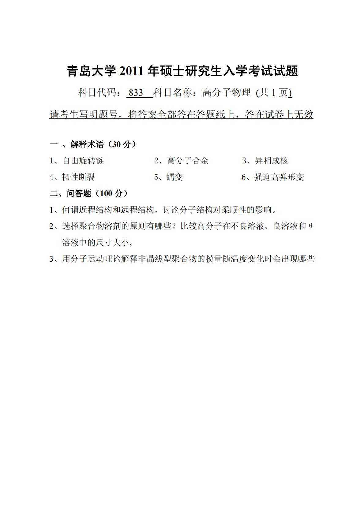 溶液中的尺寸大小。3、用分子运动理论解释非晶线型聚合物的模量随温度变化时会出现哪些1、何谓近程结构和远程结构,讨论分子结构对柔顺性的影响。2、选择聚合物溶剂的原则有哪些?比较高分子在不良溶液、良溶液和θ4、韧性断裂5、蠕变二、问答题(100分)6、强迫高弹形变一、解释术语(30分)1、自由旋转链2、高分子合金3、异相成核科目代码:833科目名称:高分子物理(共1页)请考生写明题号,将答案全部答在答题纸上,答在试卷上无效青岛大学2011年硕士研究生入学考试试题1采用膜渗透压法测得试样A和B的摩尔质量分别为4.50×105g/mol和2.25×105g/mol,试计算A、B两试样等质量混合的数均分...