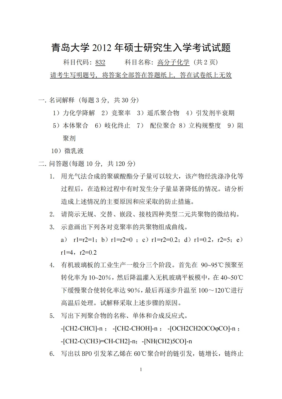 青岛大学832高分子化学与物理2012年真题