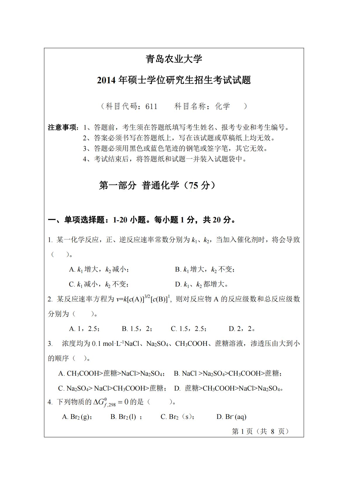 青岛农业大学2014年硕士学位研究生招生考试试题(科目代码:611科目名称:化学)注意事项:1、答题前,考生须在答题纸填写考生姓名、报考专业和考生编号。2、答案必须书写在答题纸上,写在该试题或草稿纸上均无效。3、答题必须用黑色或蓝色笔迹的钢笔或签字笔,其它无效。4、考试结束后,将答题纸和试题一并装入试题袋中。第一部分普通化学(75分)一、单项选择题:1-20小题。每小题1分,共20分。1.某一化学反应,正、逆反应速率常数分别为k1、k2,当加入催化剂时,将会导致()。A.k1增大,k2减小;B.k1增大,k2不变;C.k1减小,k2不变;D.k1、k2都增大。2.某反应速率方程为v=k[c(A...