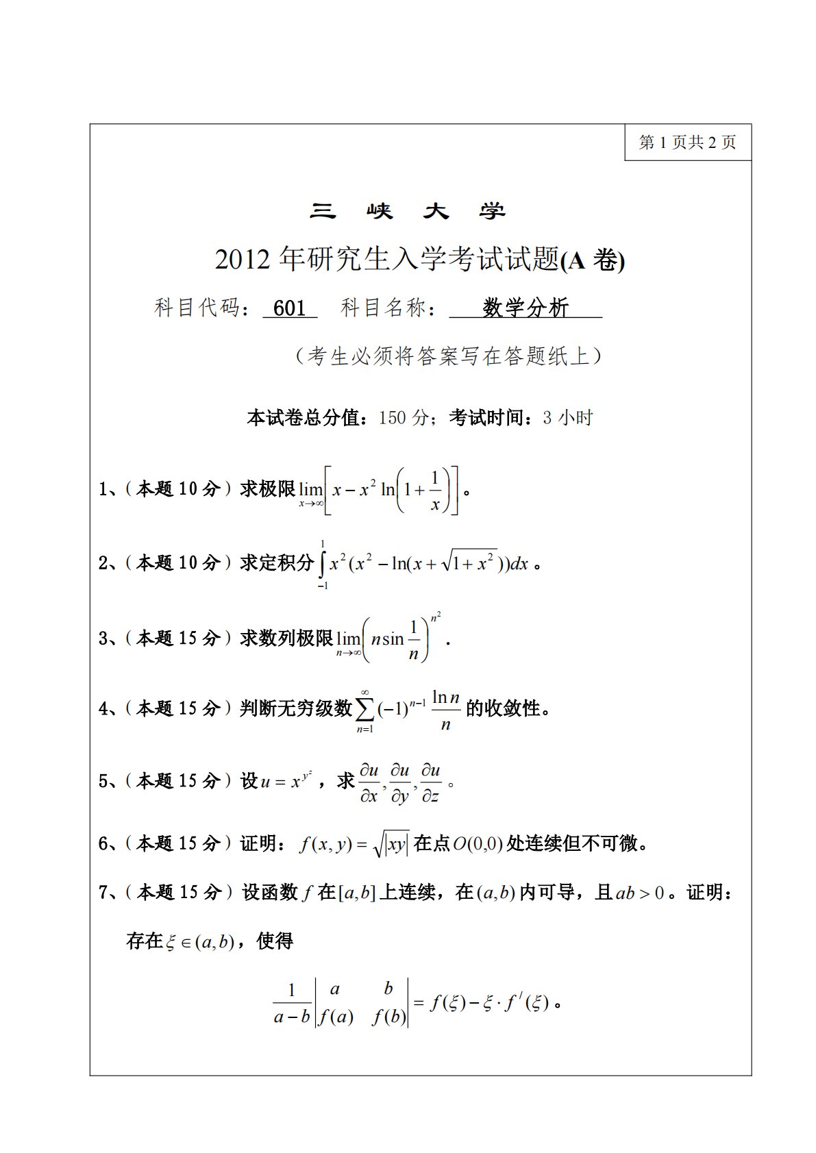 第1页共2页三峡大学2012年研究生入学考试试题(A卷)科目代码:601科目名称:数学分析(考生必须将答案写在答题纸上)本试卷总分值:150分;考试时间:3小时x111、(本题10分)求极限lximxx2ln。112、(本题10分)求定积分x2(x2ln(x1x2))dx。13、(本题15分)求数列极限ln2nnsinnim.4、(本题15分)判断无穷级数lnn1(1)n1nn的收敛性。5、(本题15分)设uxyz,求zuuuy,x,。6、(本题15分)证明:xyf(x,y)在点O(0,0)处连续但不可微。7、...