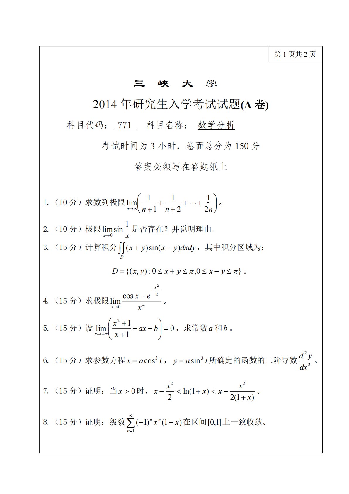 第1页共2页三峡大学2014年研究生入学考试试题(A卷)科目代码:771科目名称:数学分析考试时间为3小时,卷面总分为150分答案必须写在答题纸上nn21111.(10分)求数列极限lnim21n。x10sin2.(10分)极限lxim是否存在?并说明理由。D3.(15分)计算积分(xy)sin(xy)dxdy,其中积分区域为:D{(x,y):0xy,0xy}。4202xcosxxe4.(15分)求极限lxim。11im25.(15分)设laxbxxx0,求常数a和b。6.(15分)求参数方程xac...