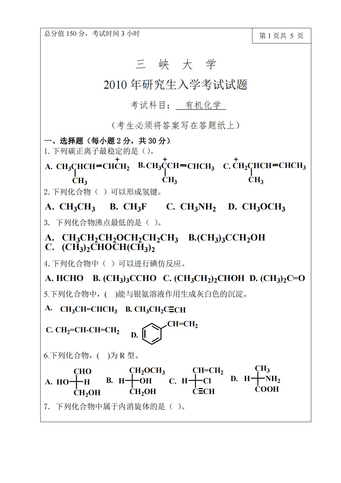 三峡大学828有机化学2010年真题