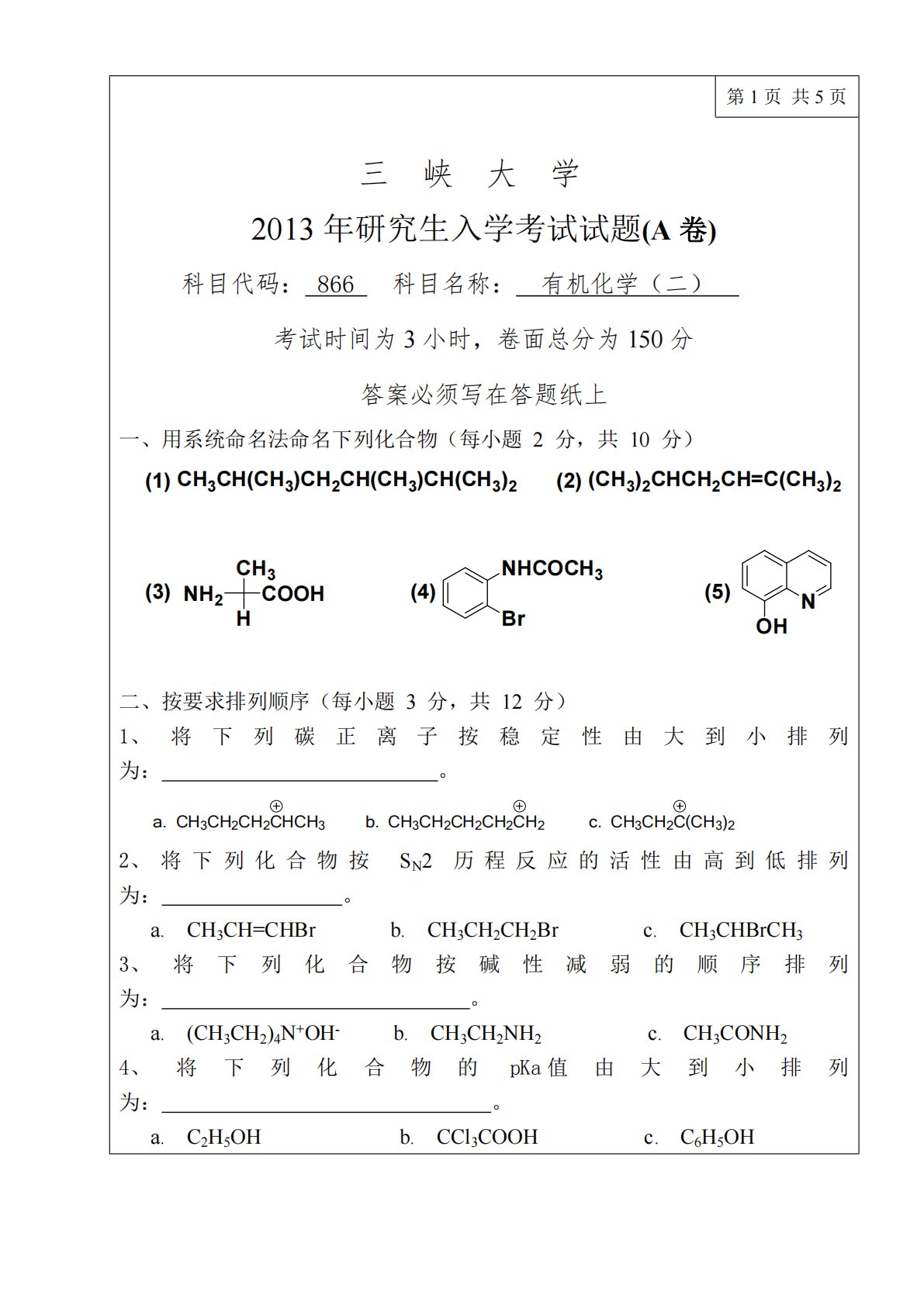 152013(A)8663150!"#$%&!'()2!10"CH3CH(CH3)CH2CH(CH3)CH(CH3)2(CH3)2CHCH2CH=C(CH3)2NH2COOHCH3HNHCOCH3BrNOH(1)(2)(3)(4)(5)#$%&'()3!12"1+,-./$012345'678a.CH3CH2CH2CHCH3b.CH3CH2CH2CH2CH2c.CH3CH2C(CH3)22+$SN2:;<=>?23@5A'678a.C...