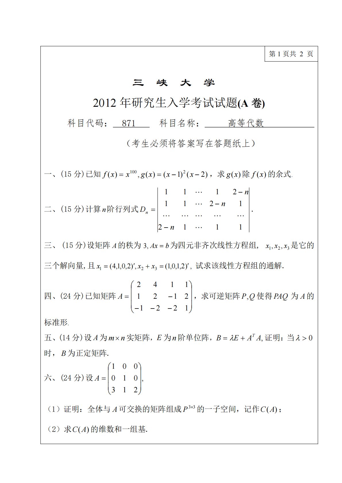 第1页共2页三峡大学2012年研究生入学考试试题(A卷)科目代码:871科目名称:高等代数(考生必须将答案写在答题纸上)一、(15分)已知f(x)x100,g(x)(x1)2(x2),求g(x)除f(x)的余式.二、(15分)计算n阶行列式21111112n11n2n1Dn.三、(15分)设矩阵A的秩为3,Axb为四元非齐次线性方程组,x1,x2,x3是它的三个解向量,且x1(4,1,0,2),x2x3(1,0,1,2),试求该线性方程组的通解.122122411四、(24分)已知矩阵A112,求可逆矩阵P,Q使得PAQ为...