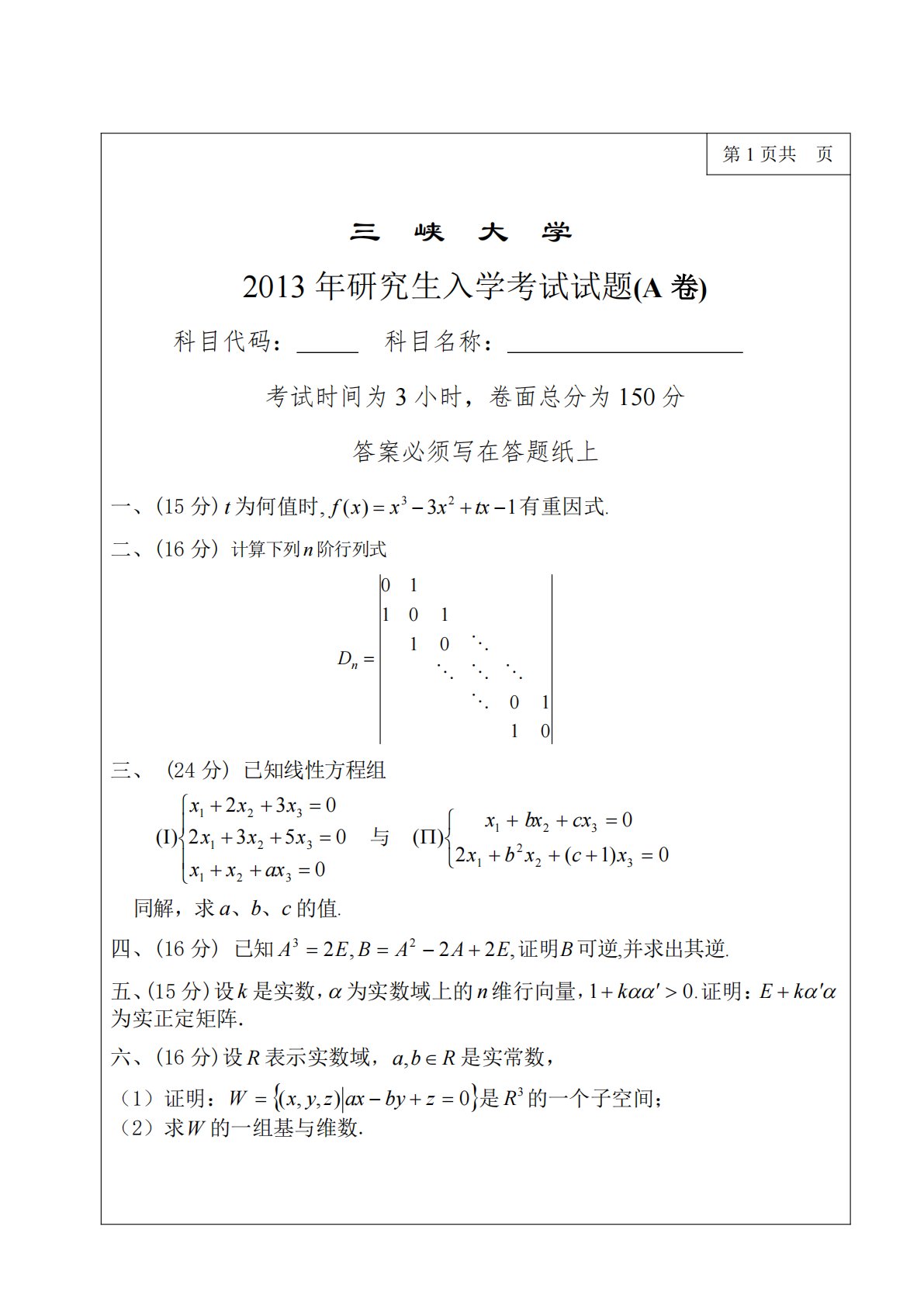 第1页共页三峡大学2013年研究生入学考试试题(A卷)科目代码:科目名称:考试时间为3小时,卷面总分为150分答案必须写在答题纸上一、(15分)t为何值时,f(x)x33x2tx1有重因式.二、(16分)计算下列n阶行列式01101011010Dn三、(24分)已知线性方程组52032()221x1x2ax30x3xx1x3x3x100与()3022321)x(cb2x1cxbxxx同解,求a、b、c的值.四、(16分)已知A32E,BA22A2E,证明B可逆,并求出其逆.五、(15分)设k是实数,为实数域上的n...