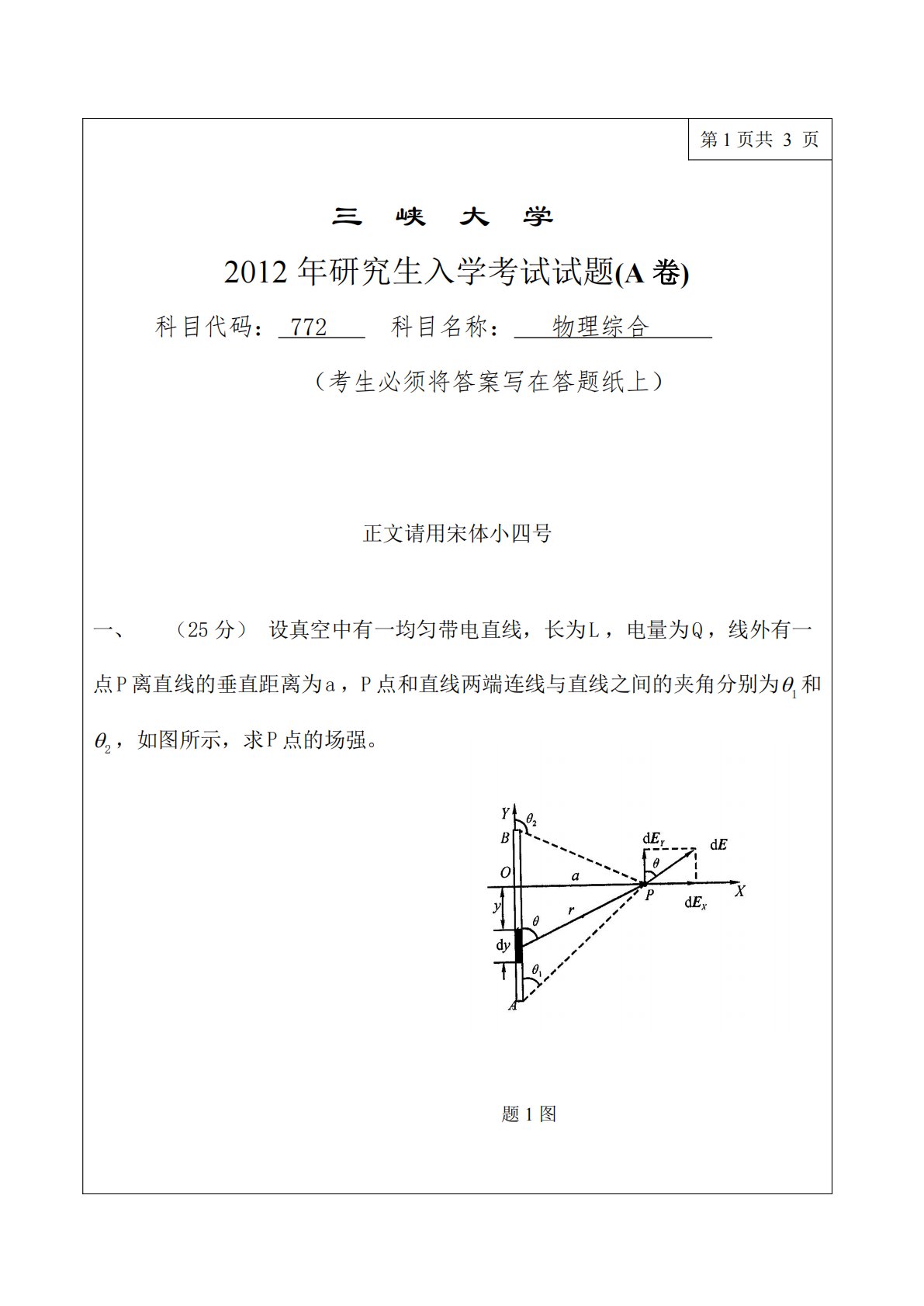 第1页共3页三峡大学2012年研究生入学考试试题(A卷)科目代码:772科目名称:物理综合(考生必须将答案写在答题纸上)一、正文请用宋体小四号(25分)设真空中有一均匀带电直线,长为L,电量为Q,线外有一点P离直线的垂直距离为a,P点和直线两端连线与直线之间的夹角分别为1和2,如图所示,求P点的场强。题1图第2页二、(25分)如图所示,一球形电容器,内球壳半径为R1,外球壳半径为R2,两球壳间充有两层各向同性均匀电介质,其界面半径为R,相对介电常数分别为r1和r2。设内球壳均匀带Q的自由电荷,外球壳均匀带Q的自由电荷,求:(1)电容器储存的电场能量;(2)电容器的电容。三、(25分)...
