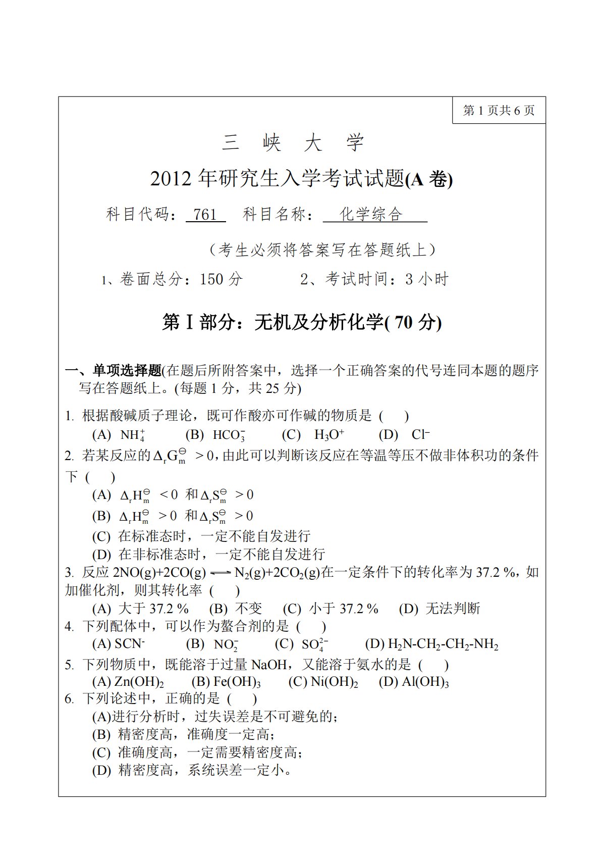 三峡大学化学综合2012年真题