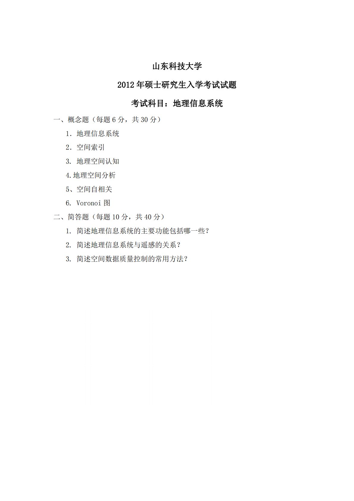 山东科技大学2012年硕士研究生入学考试试题考试科目:地理信息系统一、概念题(每题6分,共30分)1.地理信息系统2.空间索引3.地理空间认知4.地理空间分析5、空间自相关6.Voronoi图二、简答题(每题10分,共40分)1.简述地理信息系统的主要功能包括哪一些?2.简述地理信息系统与遥感的关系?3.简述空间数据质量控制的常用方法?山东科技大学2012年硕士研究生入学考试试题考试科目:地理信息系统一、概念题(每题6分,共30分)1.地理信息系统2.空间索引3.地理空间认知4.地理空间分析5、空间自相关6.Voronoi图二、简答题(每题10分,共40分)1.简述地理信息系统的主要功能包括哪...