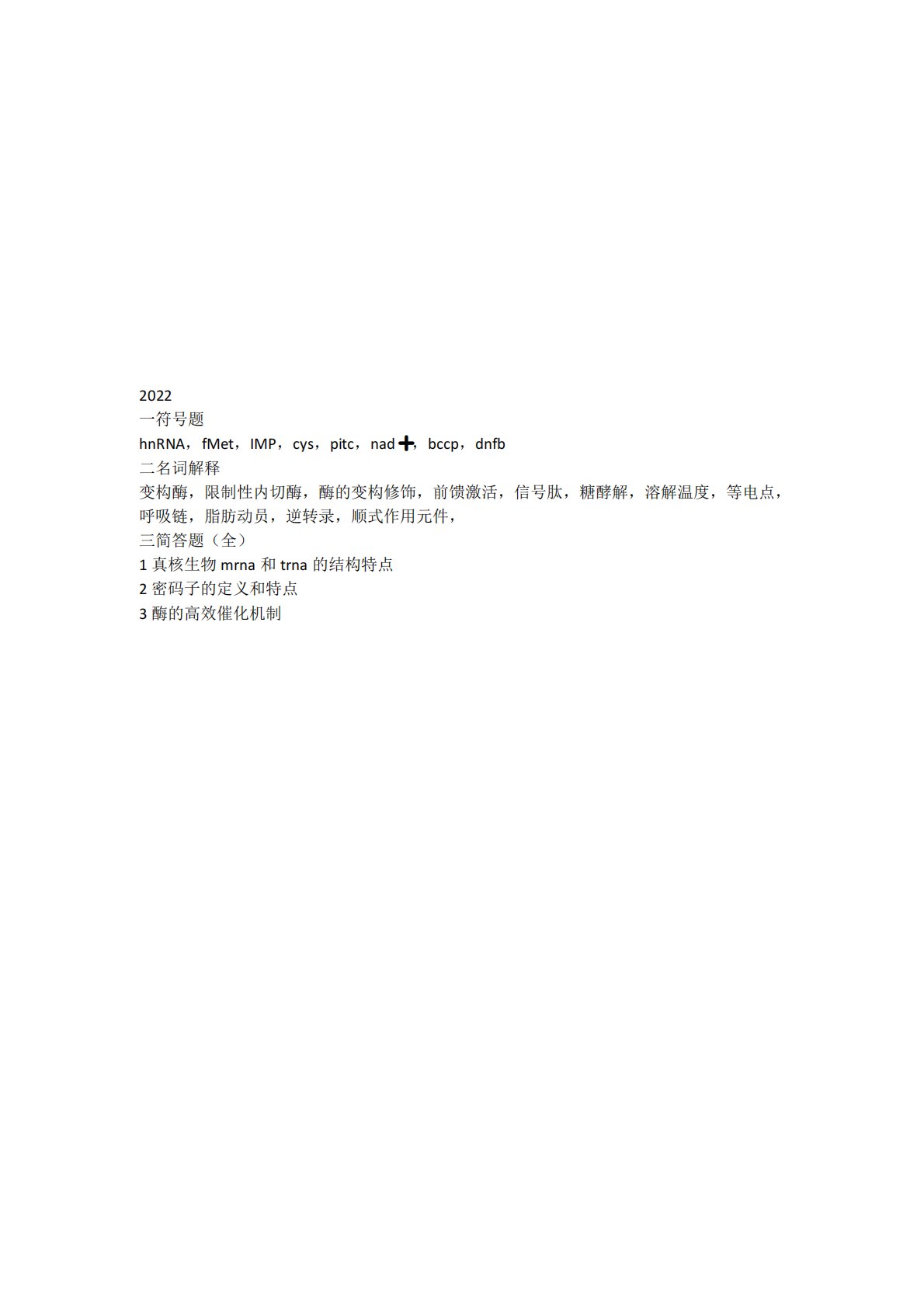 2022一符号题hnRNA,fMet,IMP,cys,pitc,nad➕,bccp,dnfb二名词解释变构酶,限制性内切酶,酶的变构修饰,前馈激活,信号肽,糖酵解,溶解温度,等电点,呼吸链,脂肪动员,逆转录,顺式作用元件,三简答题(全)1真核生物mrna和trna的结构特点2密码子的定义和特点3酶的高效催化机制2022一符号题hnRNA,fMet,IMP,cys,pitc,nad➕,bccp,dnfb二名词解释变构酶,限制性内切酶,酶的变构修饰,前馈激活,信号肽,糖酵解,溶解温度,等电点,呼吸链,脂肪动员,逆转录,顺式作用元件,三简答题(全)1真核生物mrna和trna的结构特点2密码子的定义...