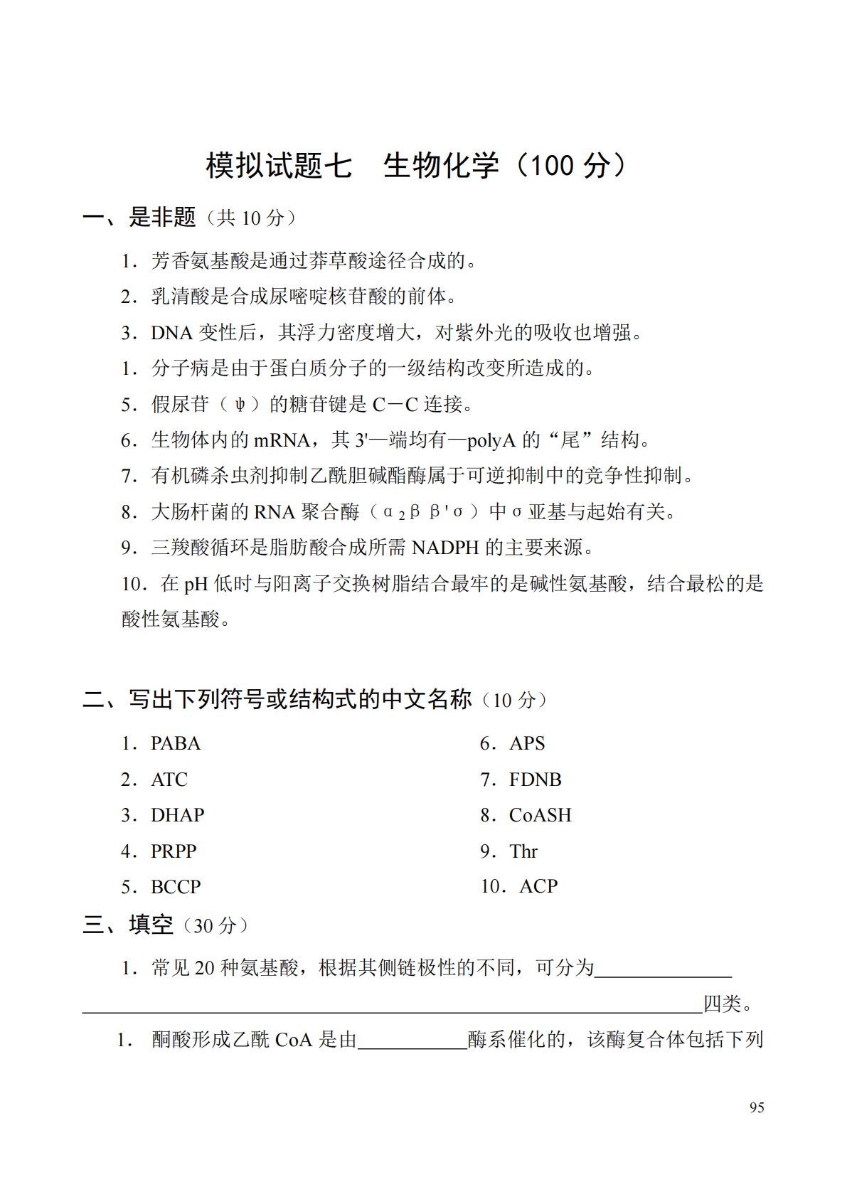 95模拟试题七生物化学(100分)一、是非题(共10分)1.芳香氨基酸是通过莽草酸途径合成的。2.乳清酸是合成尿嘧啶核苷酸的前体。3.DNA变性后,其浮力密度增大,对紫外光的吸收也增强。1.分子病是由于蛋白质分子的一级结构改变所造成的。5.假尿苷(ψ)的糖苷键是C-C连接。6.生物体内的mRNA,其3'—端均有—polyA的“尾”结构。7.有机磷杀虫剂抑制乙酰胆碱酯酶属于可逆抑制中的竞争性抑制。8.大肠杆菌的RNA聚合酶(α2ββ'σ)中σ亚基与起始有关。9.三羧酸循环是脂肪酸合成所需NADPH的主要来源。10.在pH低时与阳离子交换树脂结合最牢的是碱性氨基酸,结合最松的是酸性氨基酸。二、写出...